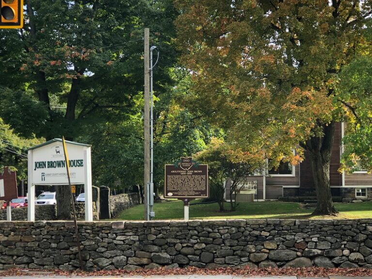 (Continued from other side) While in Akron, Brown transported freedom seekers on the Underground Railroad, which he called the “Subterranean Pass Way.” Arriving in “Bleeding Kansas” in 1855, he fought proslavery forces and gained a fearsome reputation as “Osawatomie Brown.” In October 1859, he led a failed raid on Harpers Ferry, (West) Virginia, in an effort to end slavery in the United States. He was convicted of conspiracy to incite a slave insurrection, treason, and murder, and hanged. This event played a significant role in the onset of the American Civil War.