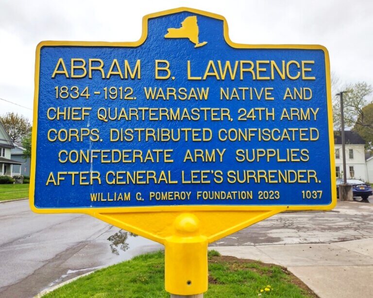 Abram B. Lawrence (1834-1912) was born and raised in Warsaw, New York. According to his biography published in Lieutenant-Colonel William H. Powell’s 1893 publication Officers of the Army and Navy Who Served in the Civil War, around 1853, as a young man, Lawrence worked as an accountant in Buffalo and then briefly owned a drugstore in Niagara Falls. In 1858, he sold his store and returned to Warsaw to care for his mother. Lawrence built and operated the Warsaw Gas Works, in addition to a foundry and machinery business.