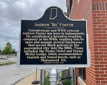 Andrew "Bo" FosterSide One: Andrew Foster was born in Indianapolis. He established a lucrative trucking company in the 1940s, enabling him to open and manage several businesses that served Black patrons in the segregated city into the 1980s. These included the Foster Hotel and Foster Motor Lodge, which accommodated tourists and famed guests, such as Muhammad Ali.