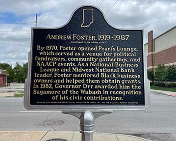 Side Two: Andrew Foster, 1919-1987 By 1970, Foster opened Pearl’s Lounge, which served as a venue for political fundraisers, community gatherings, and NAACP events. As a National Business League and Midwest National Bank leader, Foster mentored Black business owners and helped them obtain grants. In 1982, Governor Orr awarded him the Sagamore of the Wabash in recognition of his civic contributions.