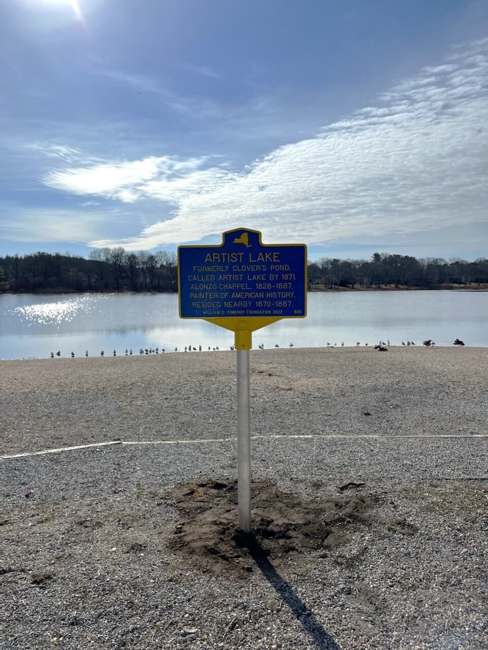 Artist Lake, located in the hamlet of Middle Island in Suffolk County, New York, was formerly called Glover’s Pond as early as 1838. However, by 1871, its name had changed to Artist Lake. The December 30, 1871 edition of the South Side Signal, published in Babylon, New York, published a letter to the editor that stated Artist Lake had been known as a “large pond” only three year prior and that the surrounding land was at the time being developed into plots to be used to build homes: