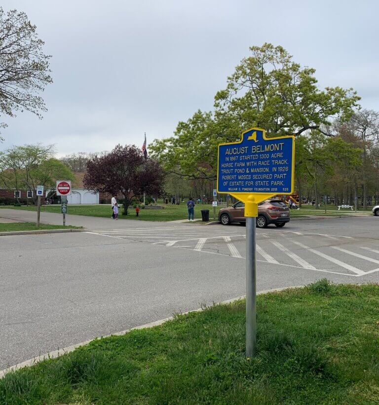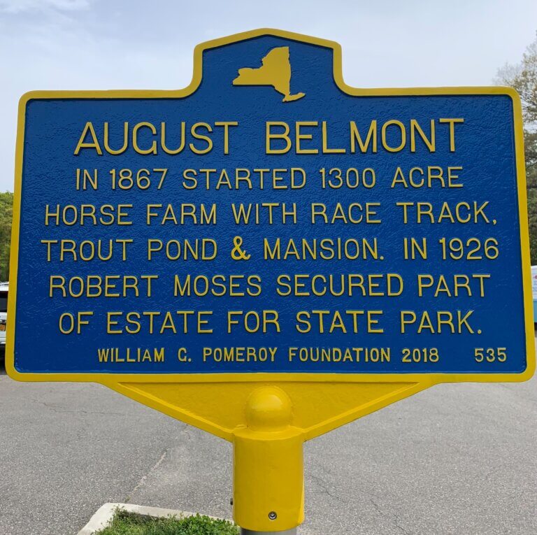 Interestingly, from 1874-1920, LIRR Railroad kept a nearby station called Belmont Junction, another William G. Pomeroy Foundation marker. Since Long Island and Where to Go (1877), a descriptive work complied for LIRR patrons, featured The Belmont Stud Farm, a.k.a. “The Nursery”, as a tourist attraction, the station may plausibly have been named after Belmont.