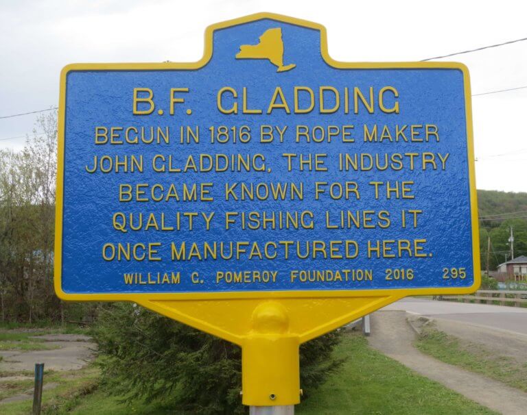 The Gladding company, established in 1816 by ropemaker John Gladding, grew to become B. F. Gladding, world renowed fishing line manufacturer. Featured in a 1949 Saturday Evening Post article, workers were known to make use of the company’s product to fish in the Otselic River during their lunch hours.