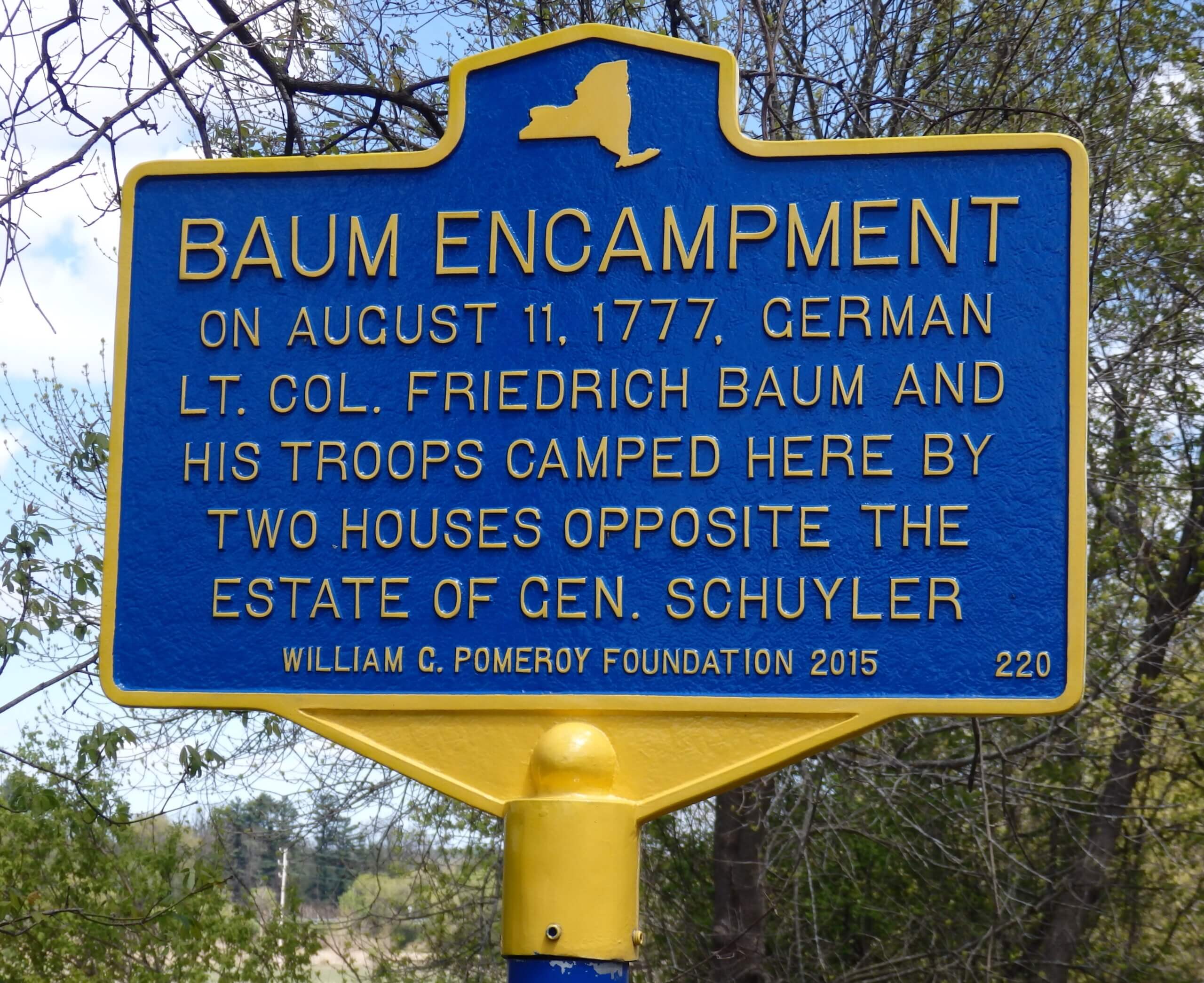 The British forces, led by General John Burgoyne, were in desperate need of supplies in the late summer of 1777. With the Continental stores just a short distance away in Bennington, Vermont, Burgoyne decided to send a detachment of British allied forces, led by German Lieutenant Colonel Friedrich Baum, to raid stores and gather supplies. Following his successful crossing of the Batten Kill River, Baum’s troops camped near this site by two houses opposite of the Estate of General Philip Schuyler.