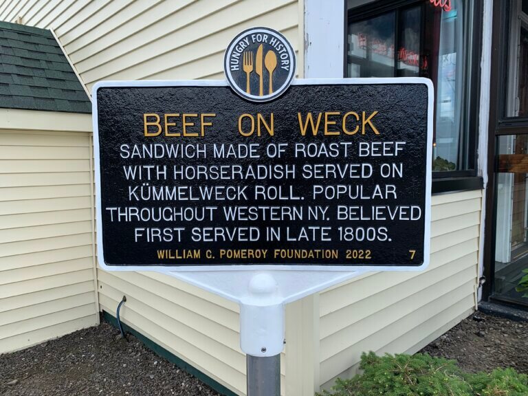 Although it’s uncertain who first served the beef on weck, local legend gives credit to a German baker named William Wahr who supposedly brought the kümmelweck roll with him to Buffalo. A crucial component of the beef on weck, the kümmelweck roll has a hard outside topped with salt and caraway seeds, and a doughy inside; this is what separates the beef and weck from other roast beef sandwiches. Buffalo eateries began serving the sandwich towards the end of the 19th century, and with the 1901 Pan American Exposition being held in Buffalo, a multitude of visitors were introduced to the beef on weck.