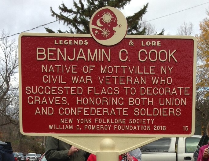 When Capt. Benjamin C. Cook (1839-1906) was Commander of Grand Army of the Republic (GAR) of the Potomac it was his duty on Decoration Day to ensure that 20,000 graves of Union and Confederate soldiers were decorated. It’s said that Cook found it difficult to secure enough flowers for all the graves, so he suggested using flags instead. Cook served with the Union’s 5th Michigan Infantry during the Civil War and fought at Gettysburg. He was originally from Mottville (Town of Skaneateles) and is interred at Richmond National Cemetery and his name appears on a plaque at the Civil War Monument in Lake View Cemetery in Skaneateles.