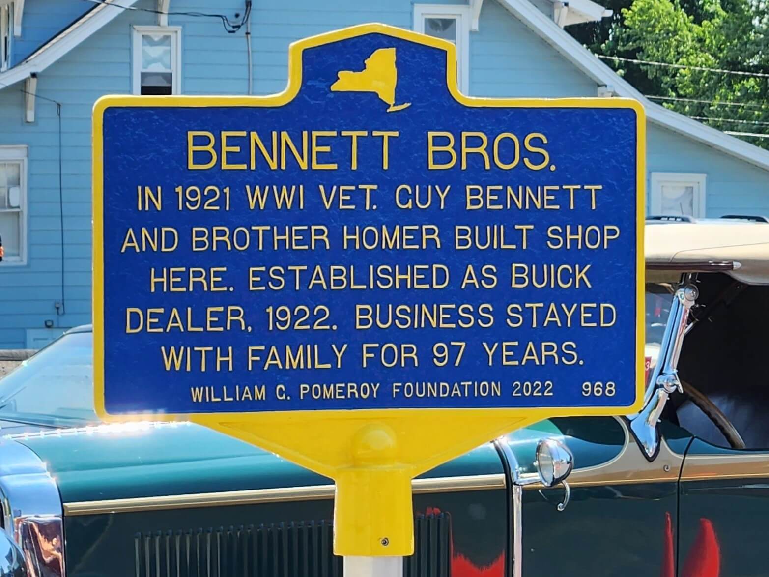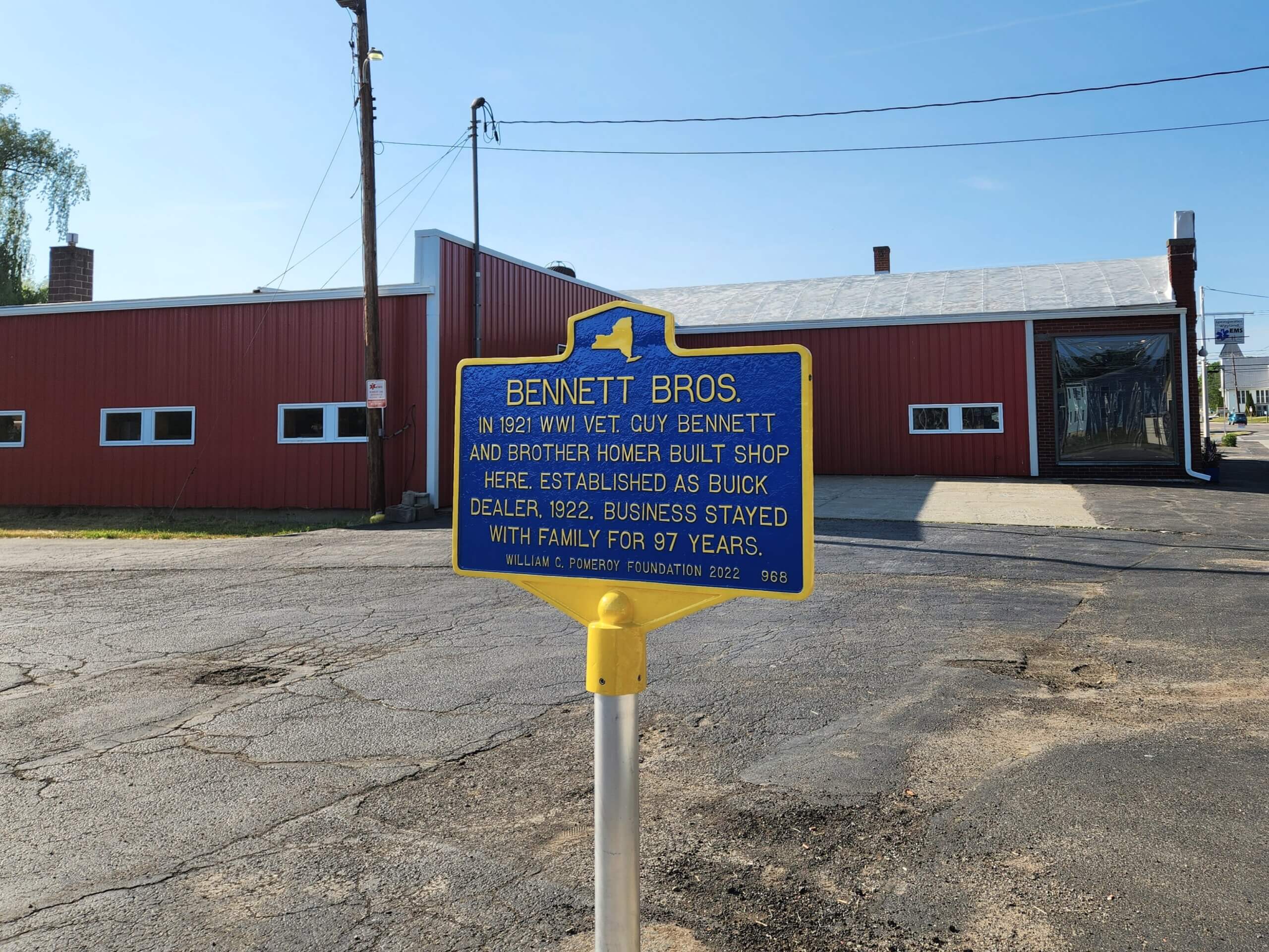 The story of the building starts with two local brothers who sensed opportunity: after returning home from France following his service as a mechanic in World War 1, Guy and his brother, Homer, went into business operating an automobile repair shop in their hometown. With financial support from their parents, the two brothers began constructing a new building to house their operations, which would become the site of the family business for nearly one hundred years. Visitors to the marker will note the inscription on the building that reads: “BENNETT BRO’S—1921.”