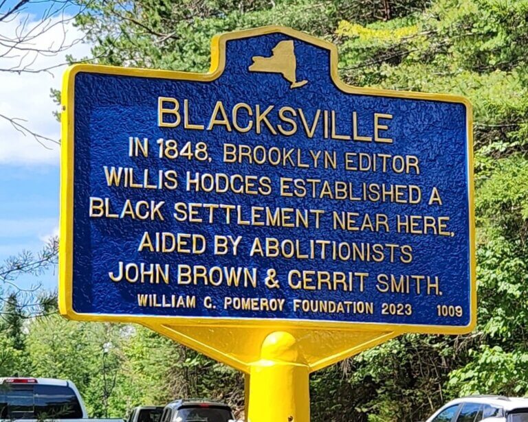 Hodges founded The Ram’s Horn, an anti-slavery newspaper. The paper drew the attention of abolitionist John Brown who offered financial support. Shortly after, Hodges led a group of families to settle on land in the Adirondacks given to them by Gerrit Smith, a wealthy philanthropist, as part of his “scheme of justice.” (see Timbuctoo marker for additional information). Willis Hodges settled his family in Franklin County near Loon Lake, adjacent to a bay that came to be known as Hodges’ Bay. During the first winter, residents of Blacksville were supplied with barrels of pork and flour sent to them by John Brown. (The Evening Post, New York, December 29, 1859) In 1848, during the first year Willis Hodges lived at Blacksville, we wrote his autobiography, Free Man of Color: The Autobiography of Willis Augustus Hodges. Returning to Brooklyn sometime after 1851, Hodges continued to travel between New York and Virginia, becoming involved in voting rights for freed Blacks. He passed away in 1890 in Virginia.