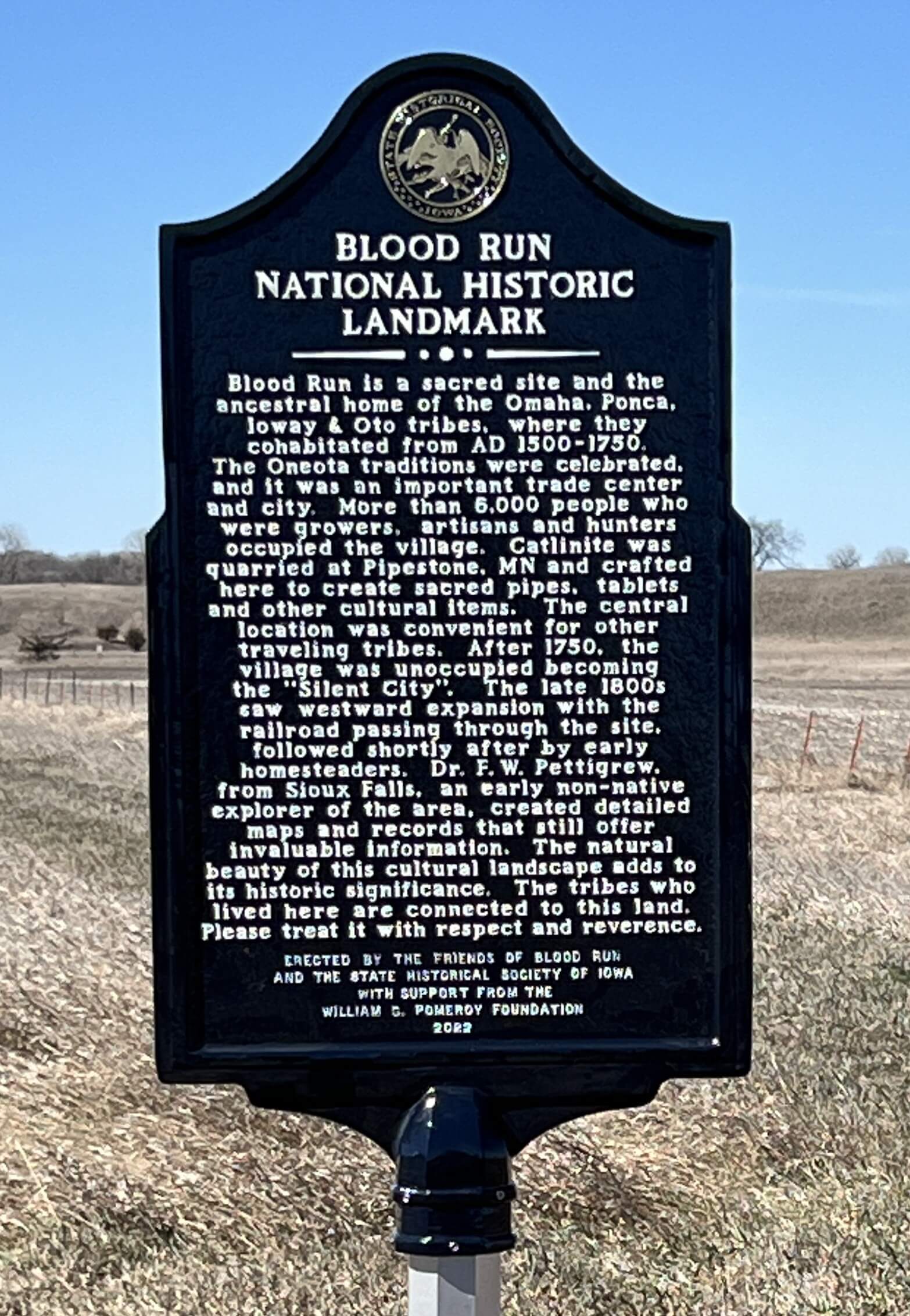 Erected by the Friends of Blood Run and the State Historical Society of Iowa with funding support from the William G. Pomeroy Foundation. 2022.