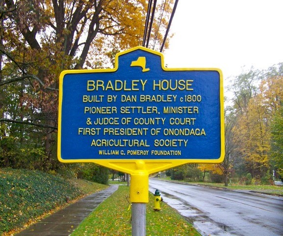 Dan Bradley arrived in Marcellus from Connecticut and erected this house about 1800. In 1807 Bradley became Onondaga County’s first judge as well as the prosperous owner of a sawmill and a significant amount of property in the southeastern part of the Village. The home changed ownership several time before being acquired by the Kate and Steve Webb who restored the structure, culminating in its placement on the National Register of Historic Places in 1979.