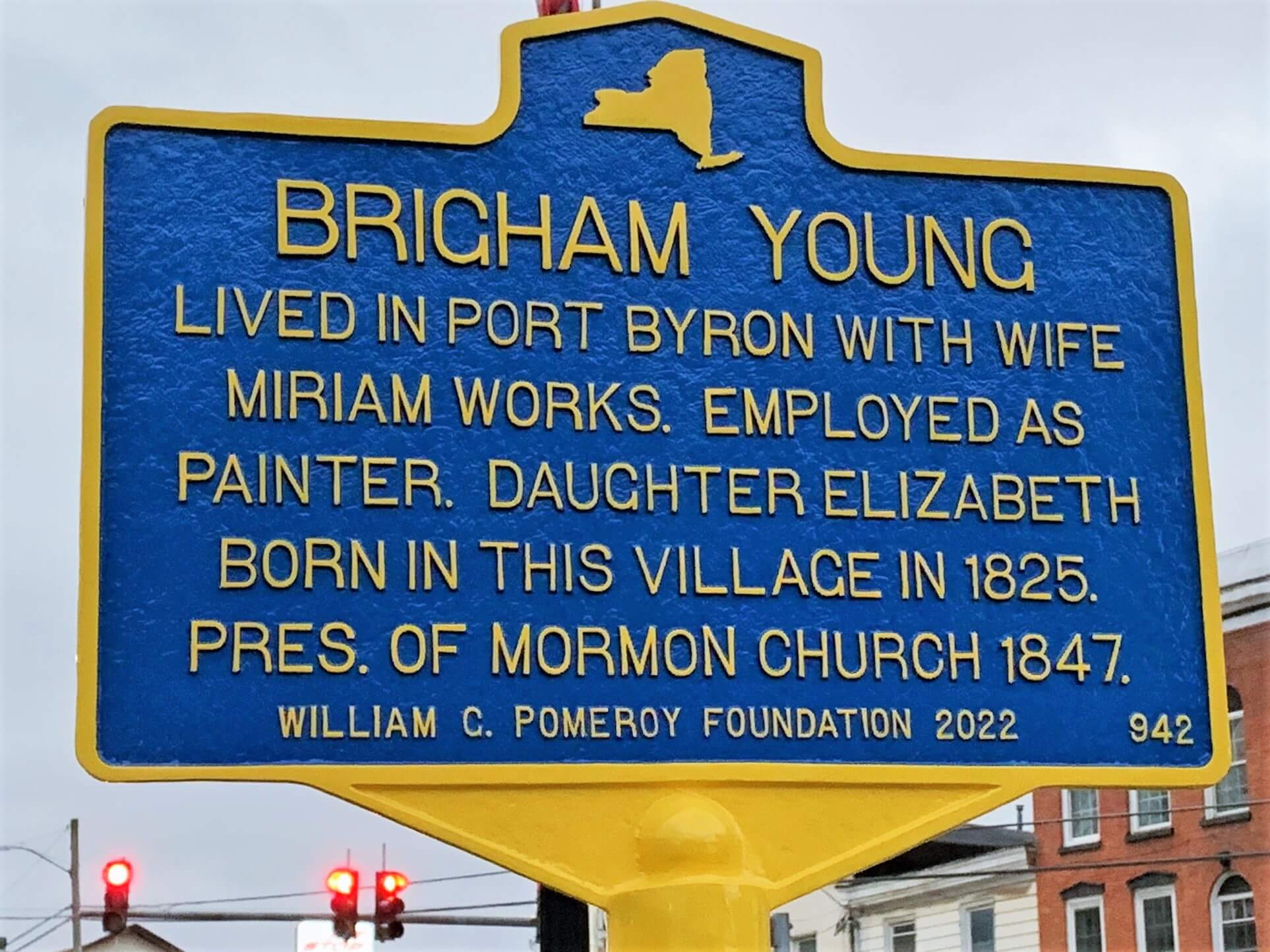 Brigham Young (1801-1877), the second President of The Church of Jesus Christ of Latter-day Saints, lived and worked for a time in Port Byron, Cayuga County, New York. In 1824, Young married Miriam Works and in 1825 their daughter Elizabeth was born in Port Byron. During his time here, Young worked as a painter on the Erie Canal, painting canal lock houses and bridges. By 1832, Young resided in Mendon, Monroe County, New York, where he converted to the Mormon faith and was baptized.