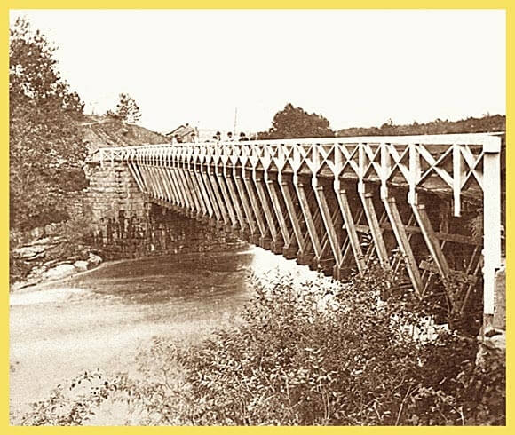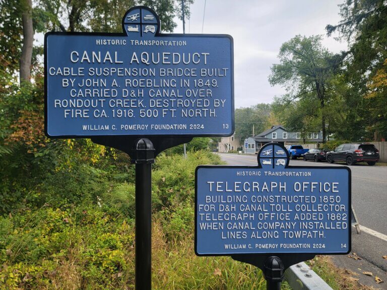 One of the earliest wire suspension structures constructed carried the Delaware & Hudson Canal over Rondout Creek. Only 5 suspension aqueducts were built, all by John A. Roebling. The High Falls single-span aqueduct replaced a two-arch stone aqueduct. Begun in 1849, construction was completed by mid-1850 at a cost of $45,406.09. While the bridge was destroyed by fire in 1916, both abutments are in good condition and demonstrate Roebling’s revolutionary suspension technology, still used in bridge construction today.