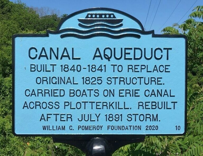 Crossing over the Plotterkill Creek, the canal aqueduct in the Town of Rotterdam served such a purpose. The original aqueduct, also known as Van Slyke’s aqueduct, was built in 1825. Following the success and growth of the Erie Canal, the original aqueduct was replaced and enlarged between 1840-1841 to accommodate more boat traffic. The aqueduct continued to be utilized over the years until damaged in a July 1891 storm. a July 23, 1891 newspaper article from the Buffalo Evening Times hints at the damage: