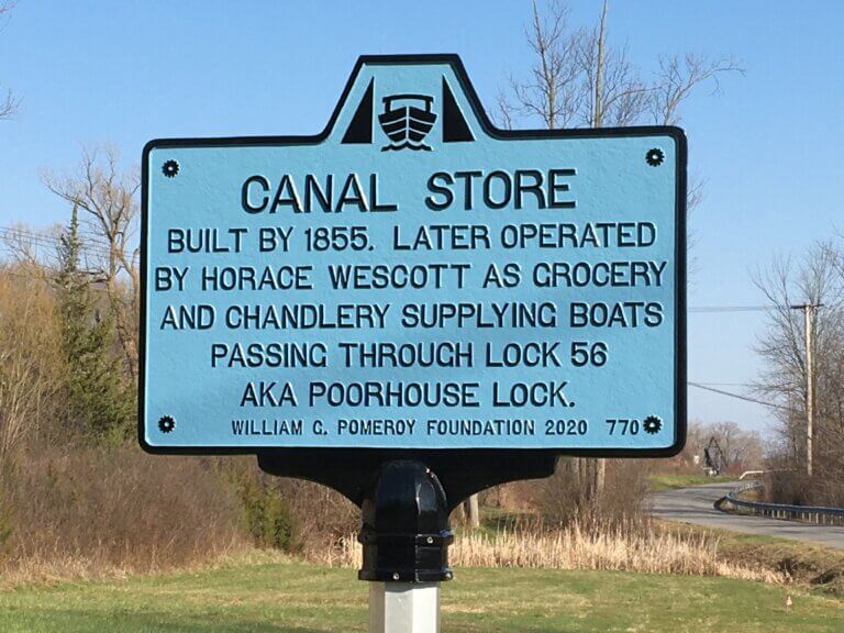 Horace Wescott’s canal store is one such example. Built by 1855 just outside of the Town of Lyons, it was situated along the canal by Lock 56, aka Poorhouse Lock, nicknamed for the County Poorhouse which stood nearby. The store was in the perfect location to serve passengers, as well as captains and their crew traveling on the canal. Years later, Wescott’s daughter, Nora Wescott Struder recalled the importance of her father’s store in a March 17, 1938 article from the Lyons Republican: