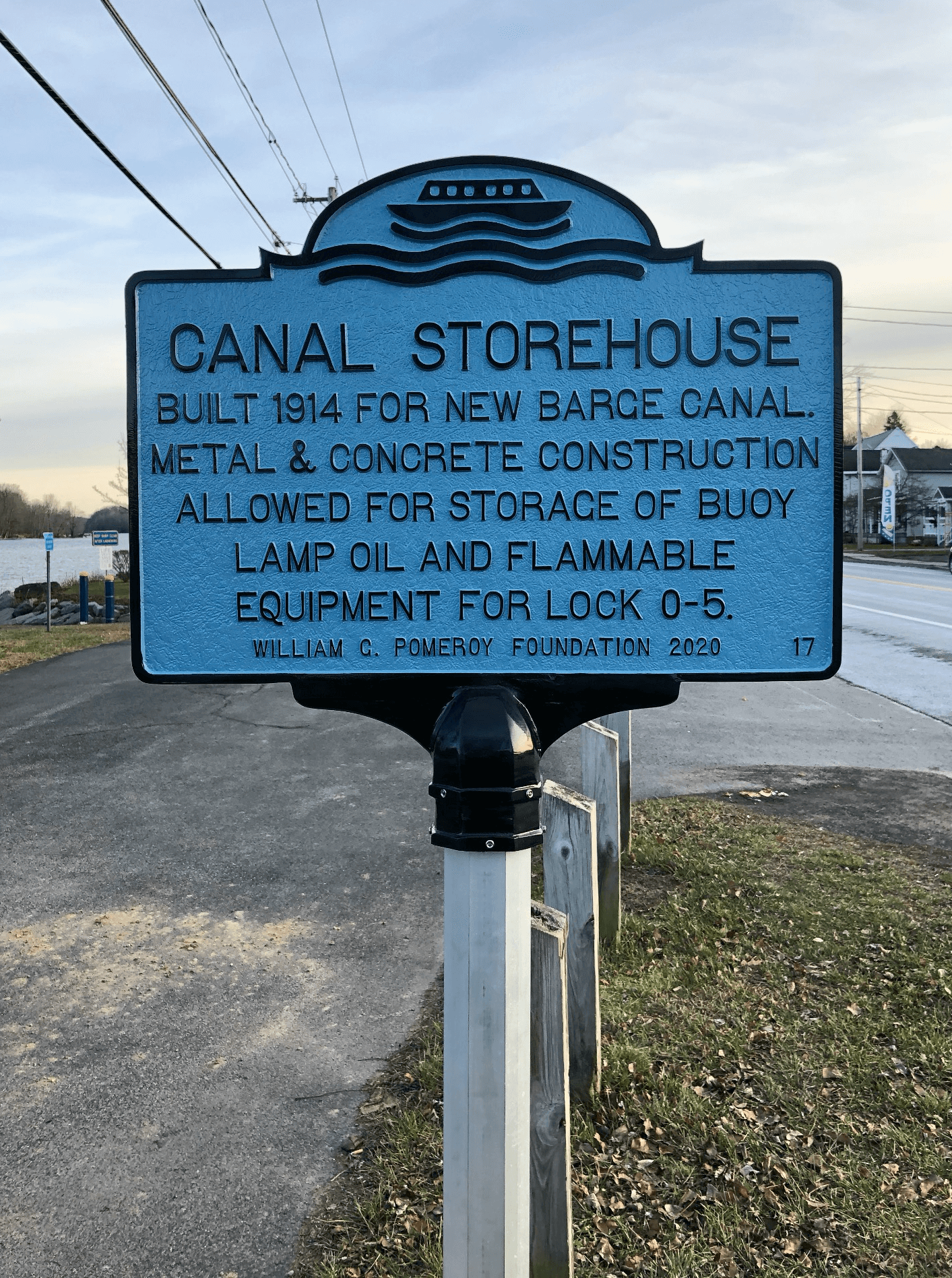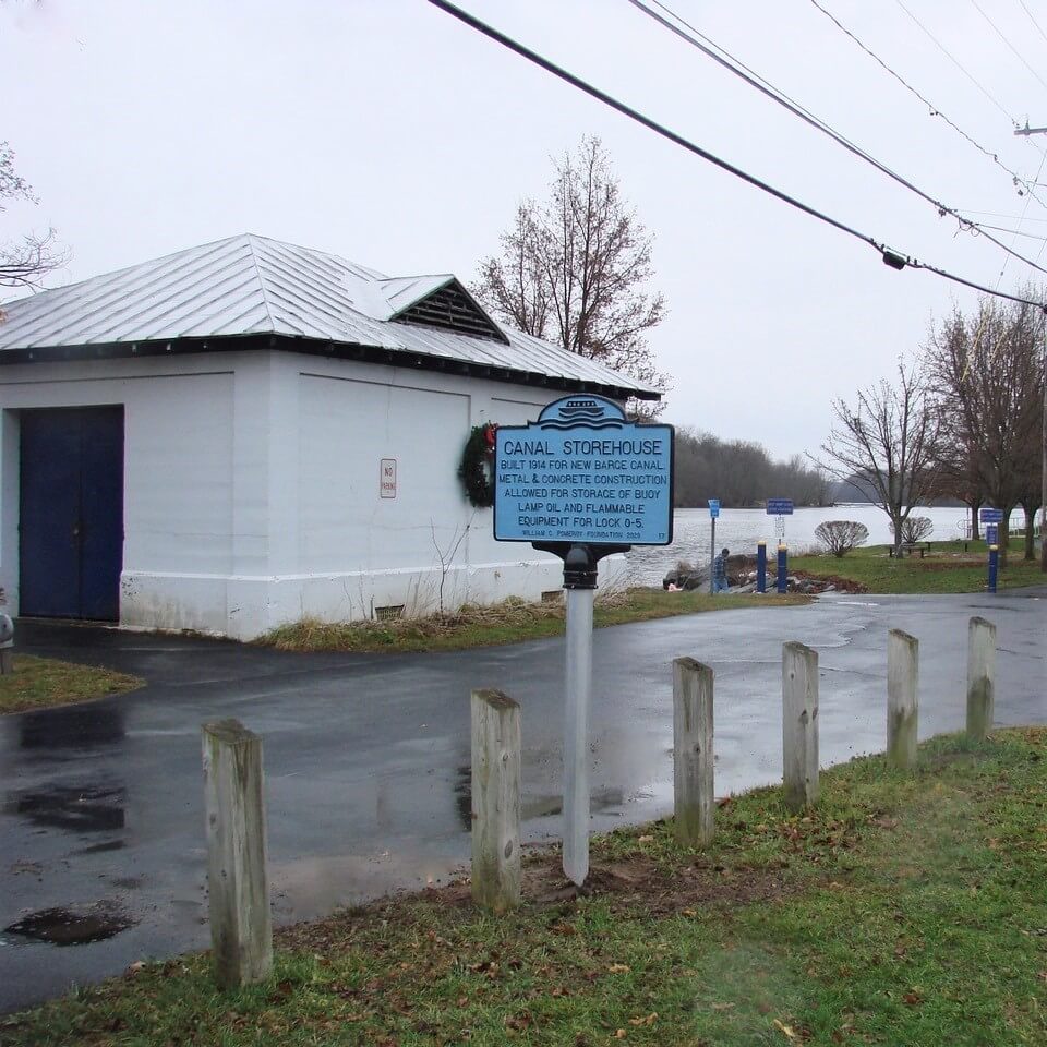 Formed by the Seneca and Oneida rivers, the Oswego River flows north from the Village of Phoenix to Lake Ontario. Completed circa 1828, the Oswego Canal incorporated a series of dams and five locks. This allowed boats to navigate the Oswego River with ease and advanced trade. The Oswego Canal underwent a series of improvements over the years to accommodate the increase in boat traffic. Around 1914 a new barge canal was planned for the Oswego Canal. A dam known as lock 0-5 and a canal storehouse is located in the small town of Minetto. Built in 1914 for the new barge canal, the storehouse was constructed out of metal and concrete. It was used to store buoy lamp oil and other flammable equipment required by Lock 0-5.