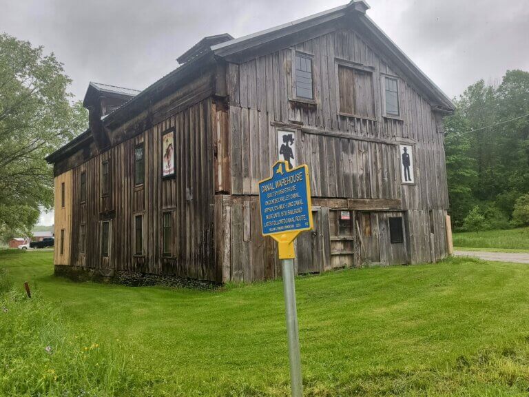 In the town of Belfast in Allegany County, New York stands a canal warehouse built by 1856 for use on the Genesee Valley Canal, an approximately 124-mile-long canal that, once completed, ran from the city of Rochester to just outside Olean in Cattaraugus County. The initial portion of the canal was completed by 1840 and ran from Rochester to Mount Morris. The remaining sections of the canal were gradually completed, with the canal reaching the town of Belfast by 1853 and the full length completed in 1862. The canal was mainly for use in transporting products such as grain and lumber, aiding the growth of communities along its path.