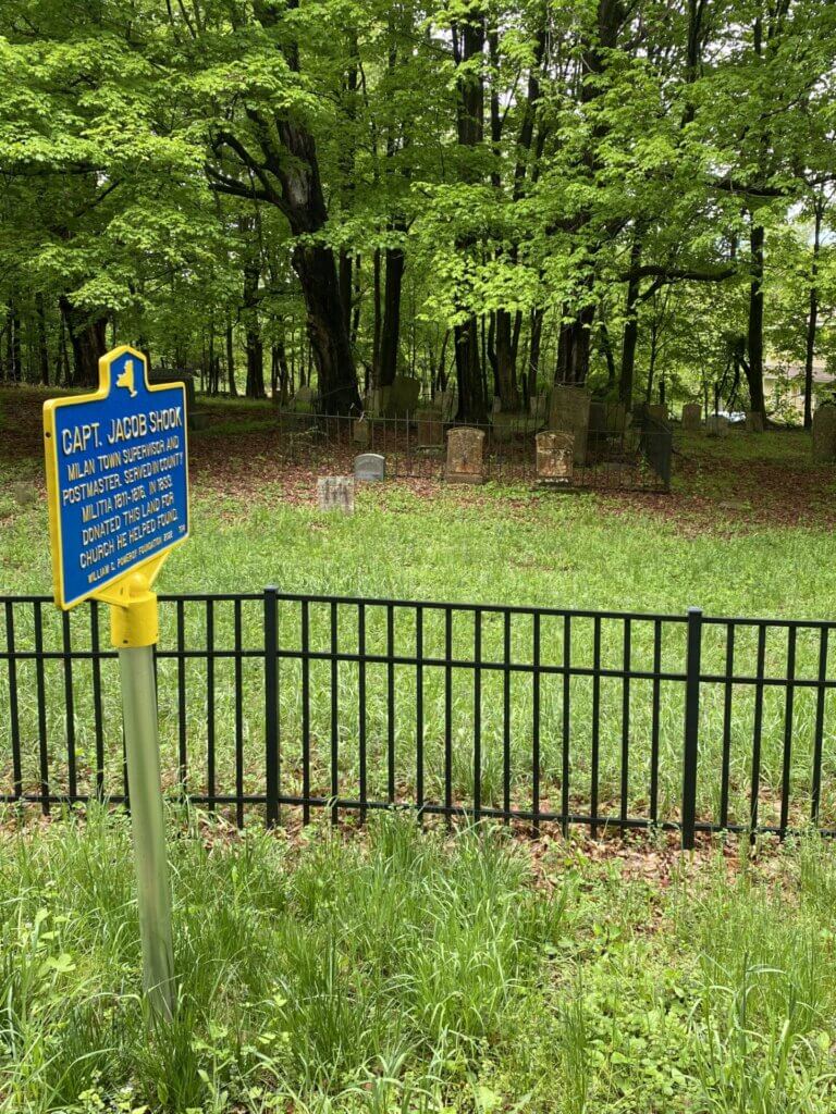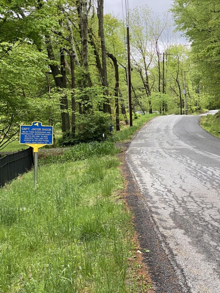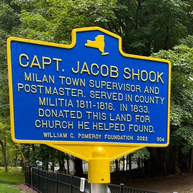 Jacob Shook was made a Captain in the Dutchess County Militia in 1811 and resigned as a Vice Captain in 1816. In 1822 he was elected Supervisor of the Town of Milan and was reelected the following year. In at least 1831 and 1833 he was Postmaster. In 1834 Jacob and his brother Peter Shook donated this land (for the price of $1) to the Methodist Society to build the Shookville Church, of which he was a founding member. The new church was dedicated June 7, 1834 and featured preaching by the Rev. Mr. Rice, Rev. Mr. Evan and other clergy.