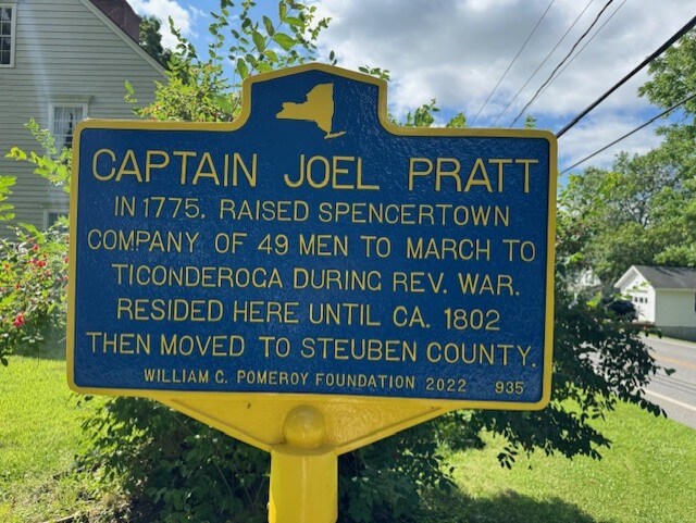 Captain Pratt resided in Spencertown, New York until circa 1802 when he moved to Steuben County. As one of the first settlers in the area, he is believed to be the eponym of Prattsburgh, a town in Steuben County. According to the 1853 History of the Settlement of Steuben County, N.Y. by Guy H. McMaster, Captain Pratt was “the pioneer of Prattsburgh” and “while there were actual residents within the boundaries of that town before Captain Pratt … its settlement and sale were conducted by him.” McMaster claims that Captain Pratt “gained an influence and enjoyed a public confidence at home, which entitle him to be styled the Founder of Prattsburgh.” Captain Pratt died in 1821 and is buried in Pioneer Cemetery, in Prattsburgh, a cemetery established in 1806 on lands owned by Captain Pratt. In 2016, a historic roadside marker was erected at Pioneer Cemetery.
