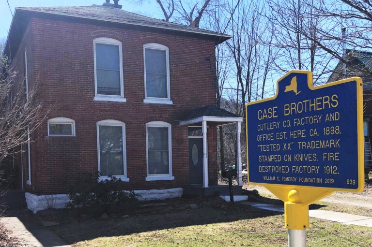 Case Brothers Cutlery began in a barn turned factory behind the house at this location. The house was utilized as an office beginning in ca. 1898 until 1912, when the factory burned down. They manufactured pocket knives, fixed bladed knives, kitchen knives and other blades. The company’s namesake, William Russell Case, first made knives with his brothers under the name Case Brothers Cutlery Company. His son, John Russell Case, worked as a salesman for his father’s company before founding W.R. Case & Sons, now located in Bradford, PA. The company used the trademark “Tested XX” which came to define the quality of the their knives.