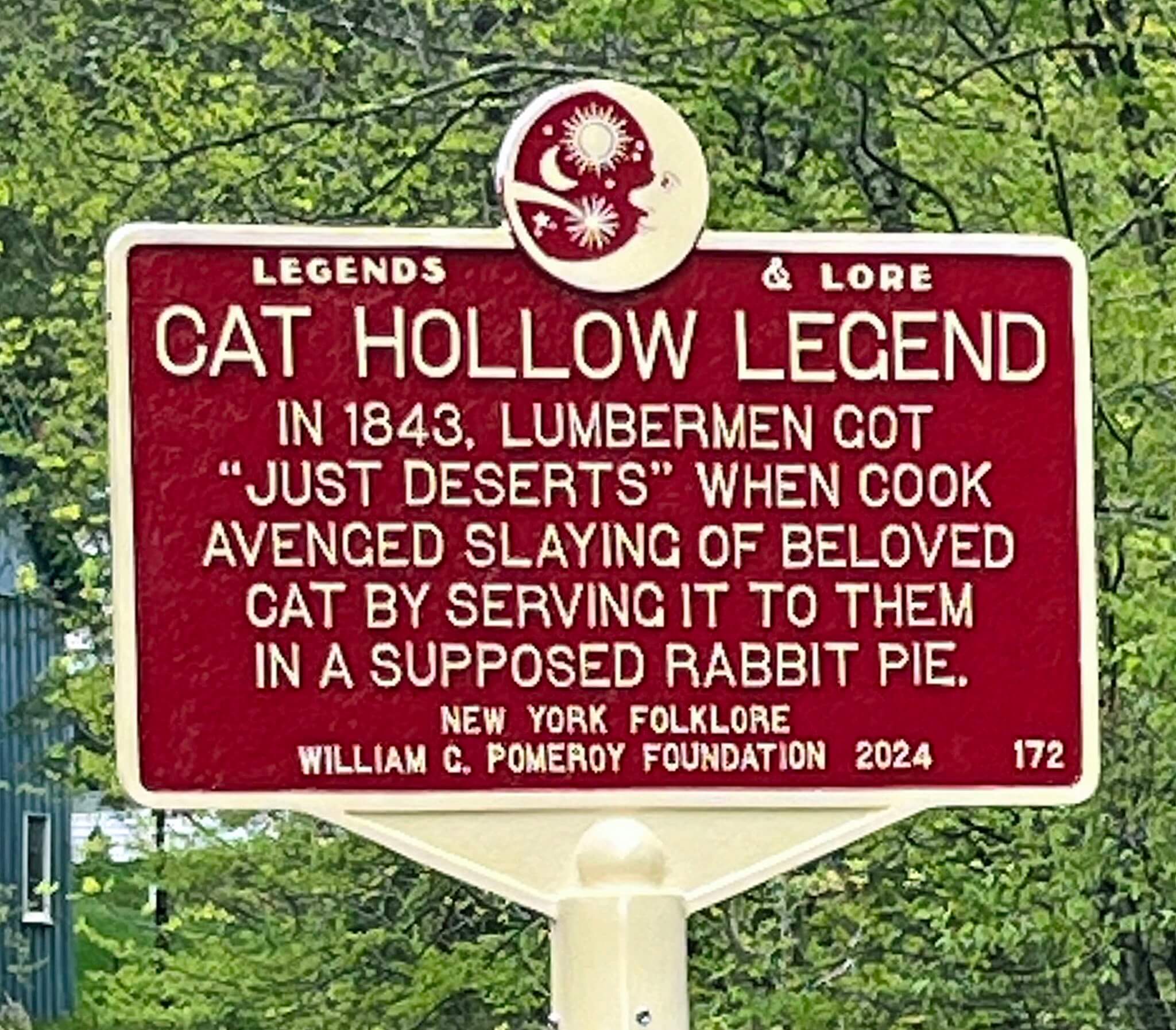 The origin of this name is attributed to an unsettling historical legend set in 1843 that is told among locals. It’s said this is when the local Terry brothers purchased a large tract of land in Colchester and started a lumber camp. They hired ten lumbermen and a woman to cook for the camp. The cook’s pet cat became the men’s object of pestering just so they could be entertained by cook’s swearing. One day one of the men went too far, and a fist fight ensued between him and the cook. The cook won but the man got his revenge by murdering the cook’s cat. When she found her beloved cat dead, the cook sought her revenge by cooking her cat into a supposed “rabbit pie” for supper. After the lumbermen had finished their dinner, the cook revealed her secret.