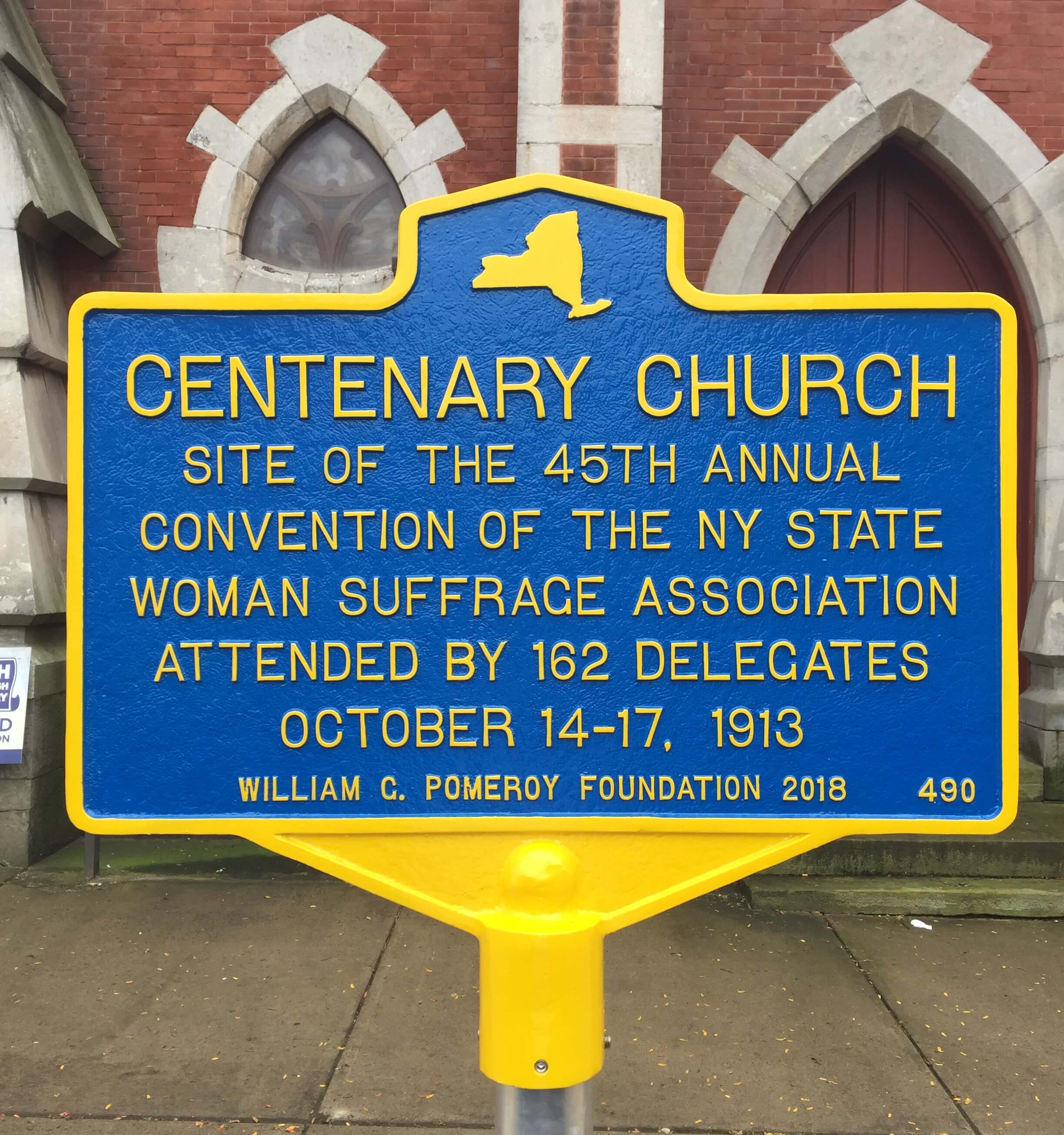 The 45th Annual Convention of the New York Woman Suffrage Association (NYWSA) was held at the Centenary Church (now Landmark Church) in the city of Binghamton, NY. From October 14 to 17, 1913, 162 delegates met at the church to elect NYWSA officers and decide organization policies.