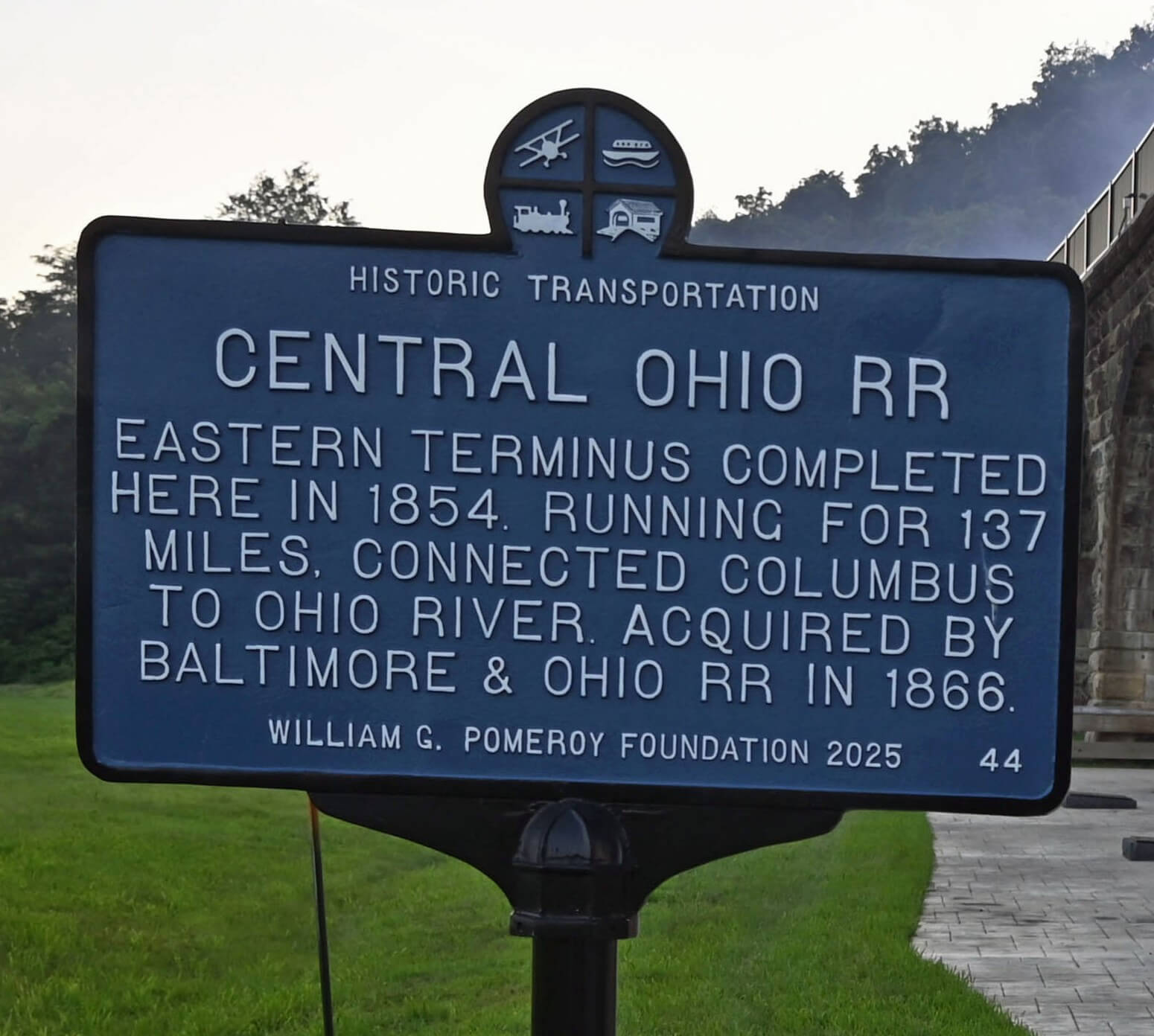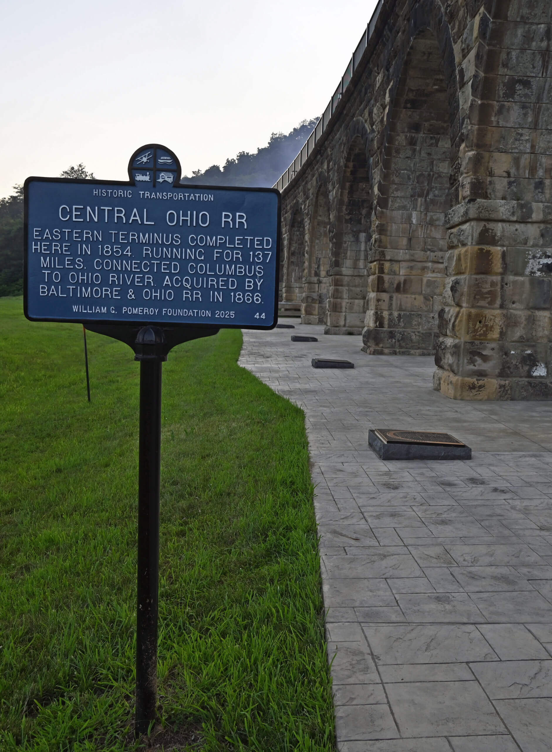 In 1866, the B&O acquired the Central Ohio Railroad, eventually operating the line as its Central Ohio Division. Shortly after this, the B&O completed several projects along the line to strengthen and improve the road, including the completion of a railroad bridge over the Ohio River in 1871. The bridge included a 43-span stone viaduct which was listed on the National Register of Historic Places in 1976. As of 2024, a 22-span portion of the viaduct is owned by the Great Stone Viaduct Historical Education Society, and the site consists of a public plaza under the viaduct along with an elevated walking trail that passes over 20 arches of the viaduct to an observation platform 35 feet above the plaza below.