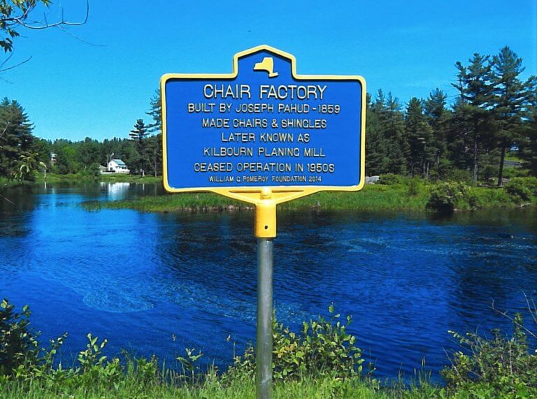 One such business was a chair factory he created in 1859 (1805 History of Lewis County). Little is known about the factory due to its location and lack of record keeping. According to the Atlas of Lewis Co., New York (1875), the chair factory consisted of two buildings. One on the edge of the Oswegatchie River and the other on a peninsula along the same river. In a 1912 map of the Town of Harrisville, the factory building on the peninsula is marked as vacant, while the other building appears to be a planing mill (Cultural Resources Survey Report of Pahud Mill Complex, Jul 1983). The next set of information available about the chair factory is a set of United States Geological Survey maps. In one dated 1916, the chair factory building on the peninsula is no longer standing (Cultural Resources Survey Report). Verne Wicks, a Harrisville business man who operated a local grist mill in the early 1900s, said in an interview conducted by the Survey Report (1983), that the site of the chair factory was used as a planing mill during the 1930s. This mill was called the Kilbourn Planing Mill and it was active until the 1950s.