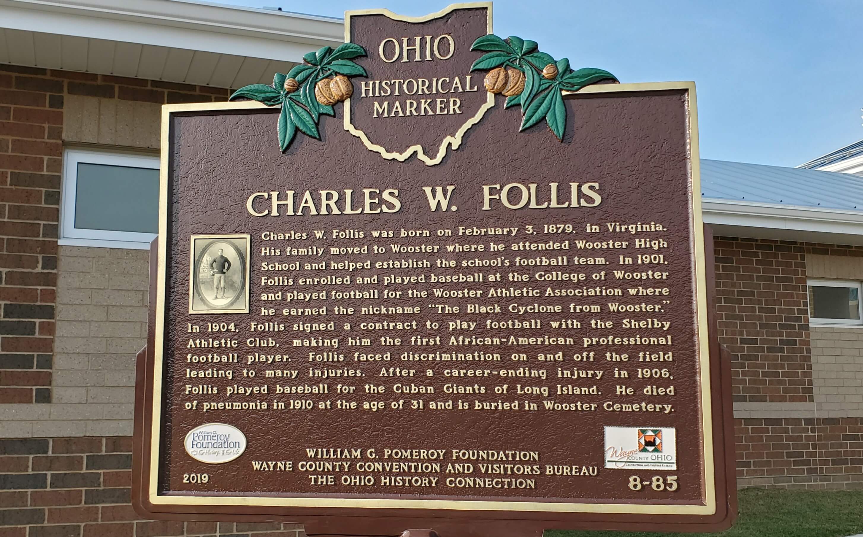 CHARLES W. FOLLISCharles W. Follis was born on February 3, 1879, in Virginia. His family moved to Wooster where he attended Wooster High School and helped establish the school’s football team. In 1901, Follis enrolled and played baseball at the College of Wooster and played football for the Wooster Athletic Association where he earned the nickname “The Black Cyclone from Wooster.” In 1904, Follis signed a contract to play football with the Shelby Athletic Club, making him the first African-American professional football player. Follis faced discrimination on and off the field leading to many injuries. After a career-ending injury in 1906, Follis played baseball for the Cuban Giants of Long Island. He died of pneumonia in 1910 at the age of 31 and is buried in Wooster Cemetery.