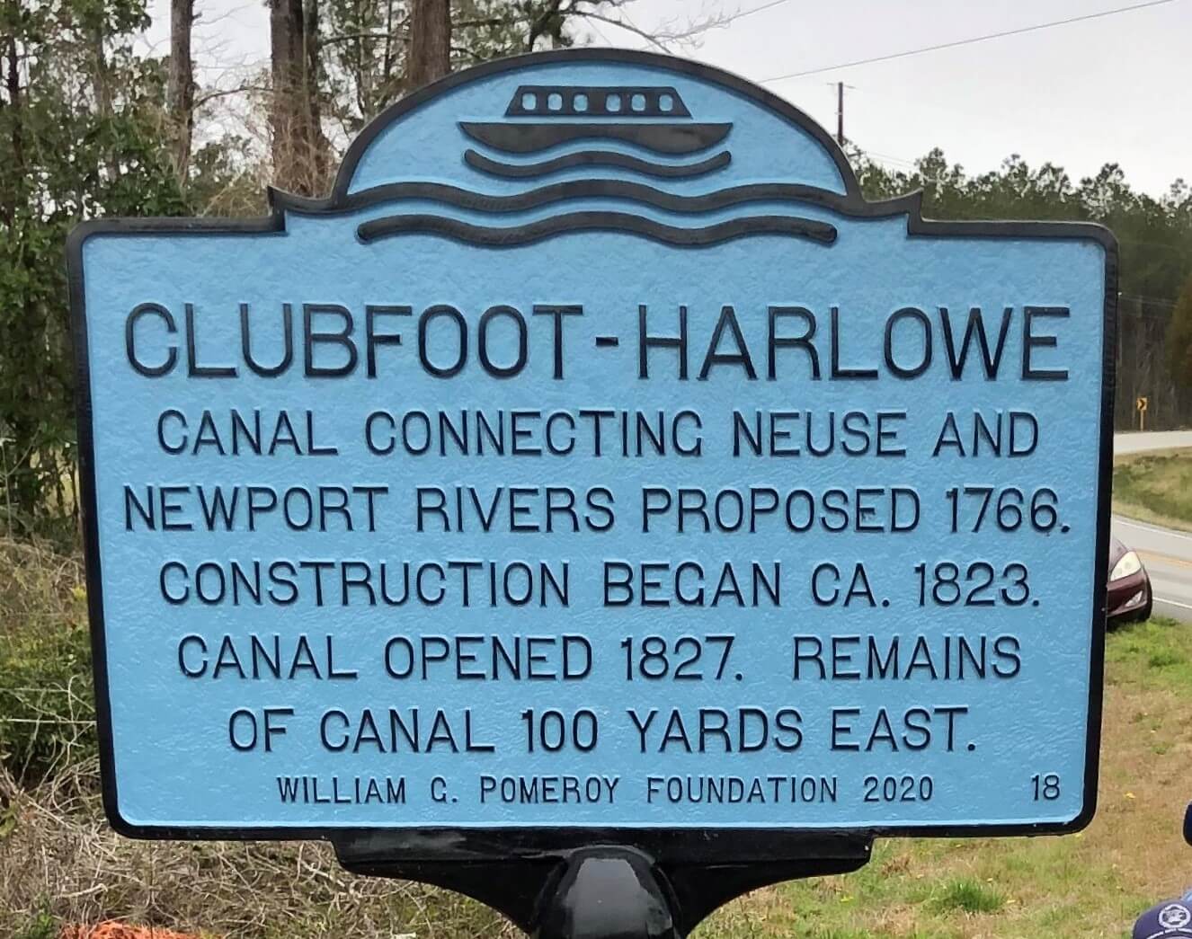 The remains of the Clubfoot and Harlowe Canal are found 100 yards east from this site in Newport, North Carolina. Proposed as early as 1766, the Clubfoot Harlowe Canal was intended to connect the Neuse and Newport Rivers, as described in the Acts of the North Carolina General Assembly: