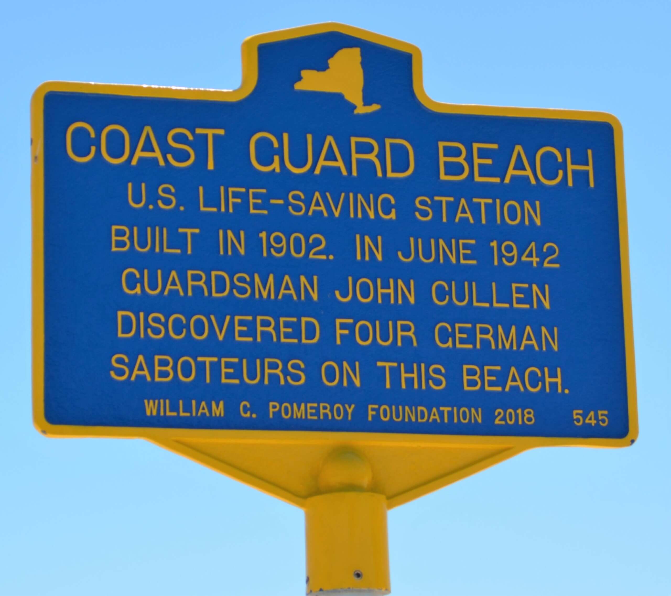 In the 1902 article, while Capt. Jesse Edwards explained “the men have the consciousness of doing their full duty and being always prepared for any emergency that could reasonably be expected,” he added that “so far there ha[d] been no great disasters. The work has been of a routine character.” That all would change when Amagansett Station became the site of a notable incident during World War II. On June 13, 1942, under the cover of heavy fog, a group of Nazi saboteurs landed on Amagansett Beach, also known as Coast Guard Beach. Their mission was to wreak havoc and sabotage factories geared toward the war effort. Fortunately the plot was uncovered before it even began. Coastguardsman John Cullen discovered the four German soldiers on the beach. Despite their attempt to bribe Cullen, he alerted his superiors about the suspicious activity. The Coast Guard investigated. Chief Boatswain’s Mate Warren Barnes found the landing site and uncovered discarded German uniforms and four boxes of explosives buried in the sand. The Station website adds that after one of the would-be saboteurs turned himself in to the F.B.I., the others were apprehended and tried. This Amagansett incident led to the establishment, only one month later, of the Coast Guard Beach Patrol, which grew to consist of 24,000 men and was an important component of coastal defense during the war.