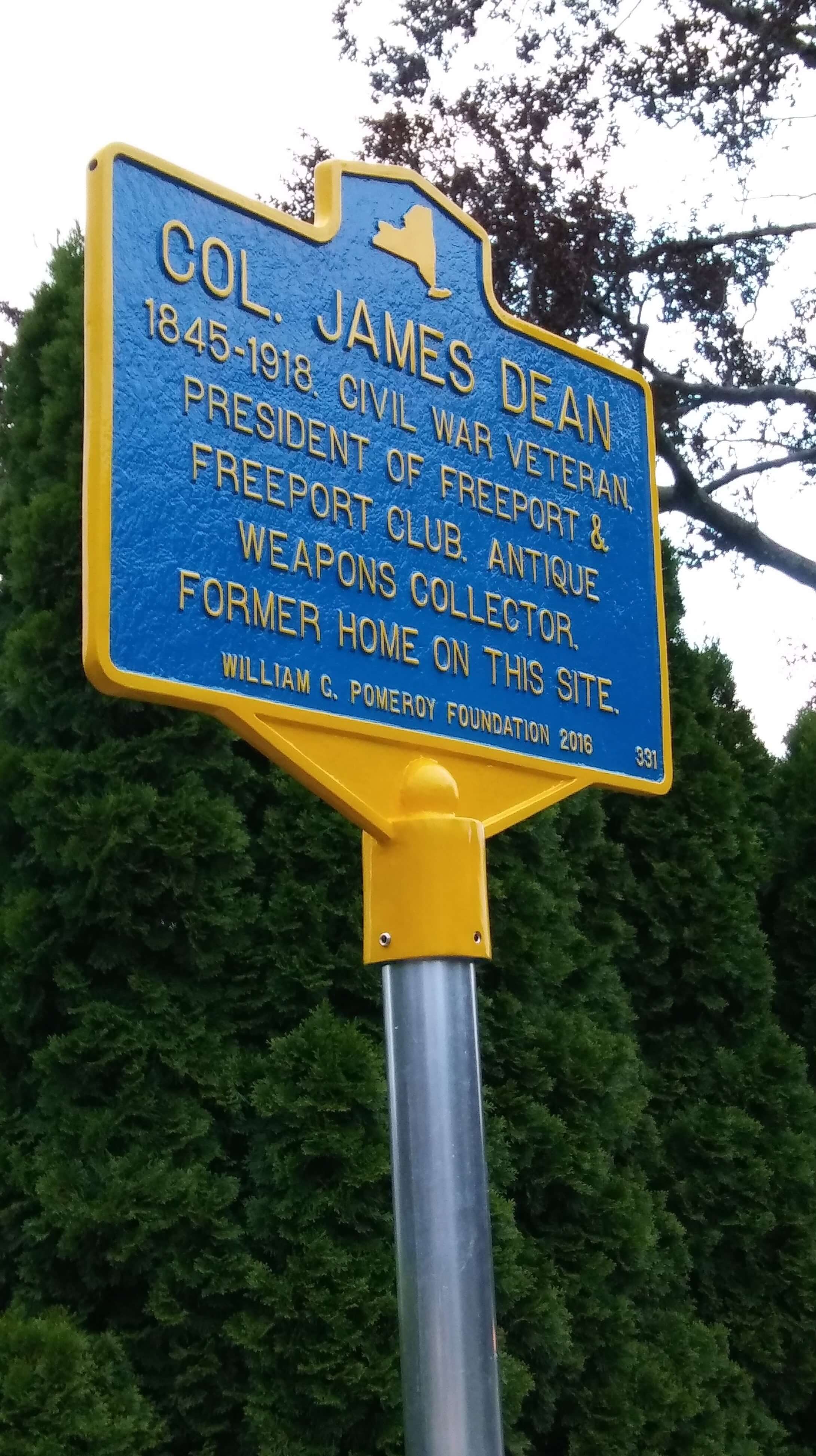 According to Freeport History Encyclopedia, James Dean was the fourth president (mayor) of Freeport (1902 to 1905). A wealthy retired merchant from Brooklyn, Dean was a Civil War veteran and served as a captain with the 72nd New York Volunteer Infantry Regiment and was a past commander of the Grant Post, Grand Army of the Republic (GAR). He collected flintlock muskets, powder horns, swords and other war relics. Dean also served as the treasurer of the South Shore Yacht Club. At the turn of the twentieth century, he was president of the Freeport Club. The source adds that Dean Street is also named after him.