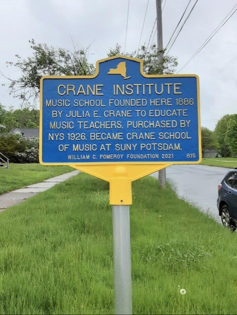In 1886, musician and teacher Julia Ettie Crane (1855-1923) founded the Crane Normal Institute of Music. The school trained public school music teachers and Julia served as its director until her death. Her obituary published in the Courier Freeman noted that she was “nationally known as a leader in the field of public school teaching.” After Julia’s death, New York State purchased the Crane Normal Institute of Music in 1926, establishing it as a department of Potsdam State Normal and Training School, later SUNY Potsdam. It continues today as the Crane School of Music, one of three schools that make up SUNY Potsdam. In 1986 Julia Crane was inducted into the Music Educators Hall of Fame.