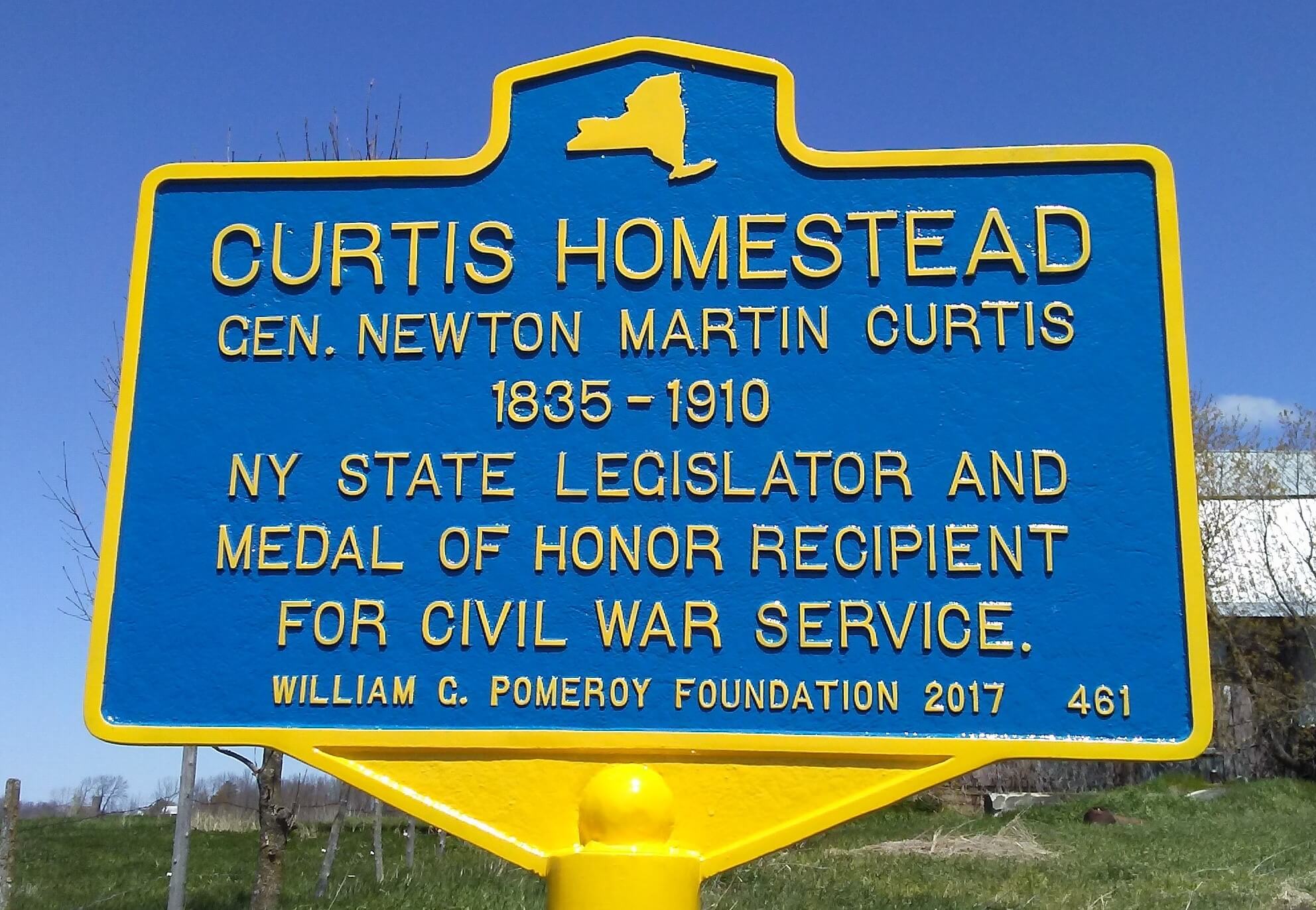 This is the site of the Curtis Homestead which was the home of General Newton Martin Curtis (1835-1910). General Curtis served during the U.S. Civil War, received the Medal of Honor, and later served as an assemblyman for the New York State Legislature. His Medal of Honor citation reads that Curtis was “the first man to pass through the stockade, he personally led each assault on the traverses and was 4 times wounded.”