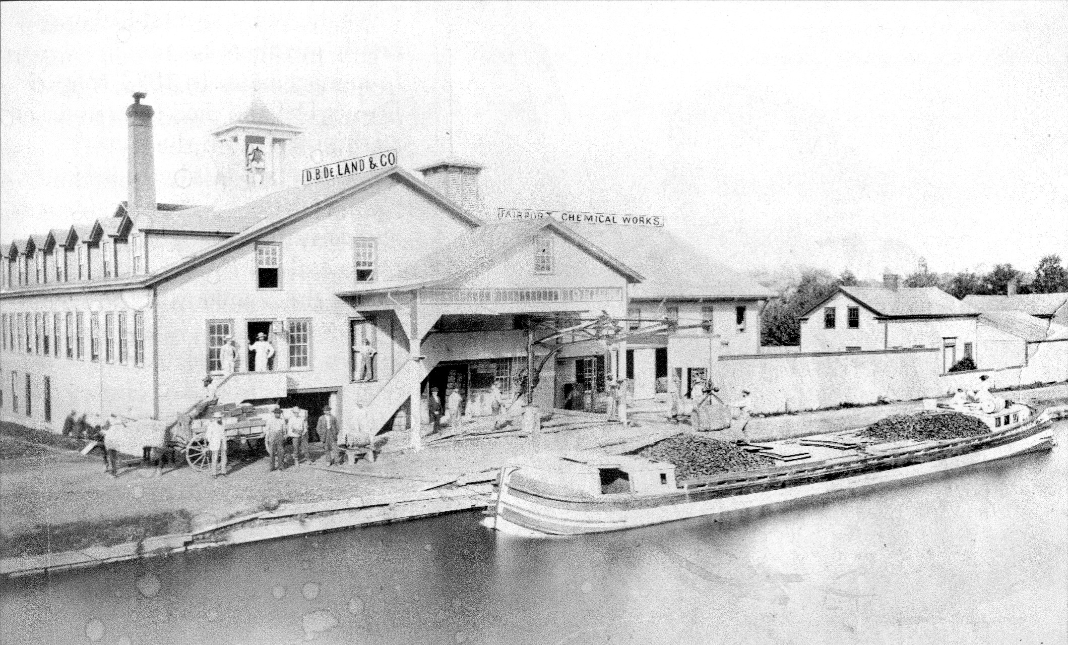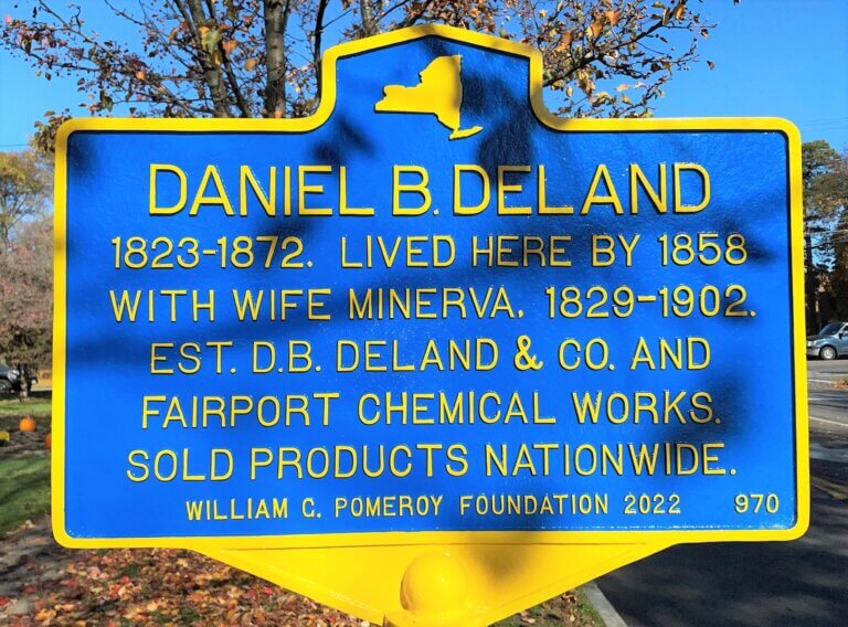 Daniel B. DeLand (1823-1872) and his wife Minerva A. Parce DeLand (1829-1902) settled in Fairport in Monroe County, New York in the early 1850s. Working as a chemist and manufacturer, he established D.B. DeLand & Co. and the Fairport Chemical Works. By 1858, his home was located on North Main Street and his factory was on the north side of the Erie Canal in Fairport. Products manufactured at D.B. DeLand & Co. and the Fairport Chemical Works included cream of tartar, sal soda, and saleratus, the name then used for baking soda. By the late the 1850s, his products were being sold all over the country.