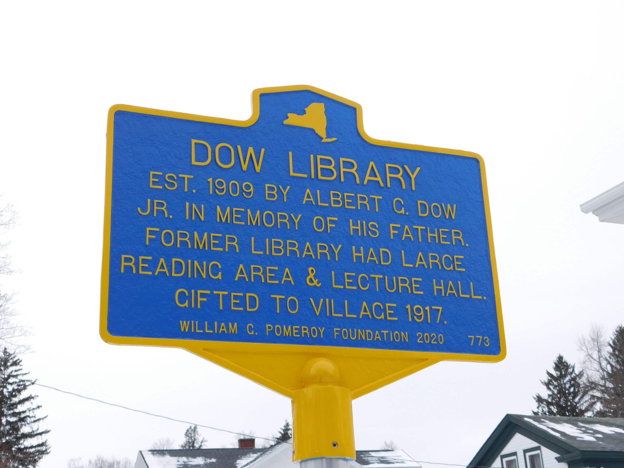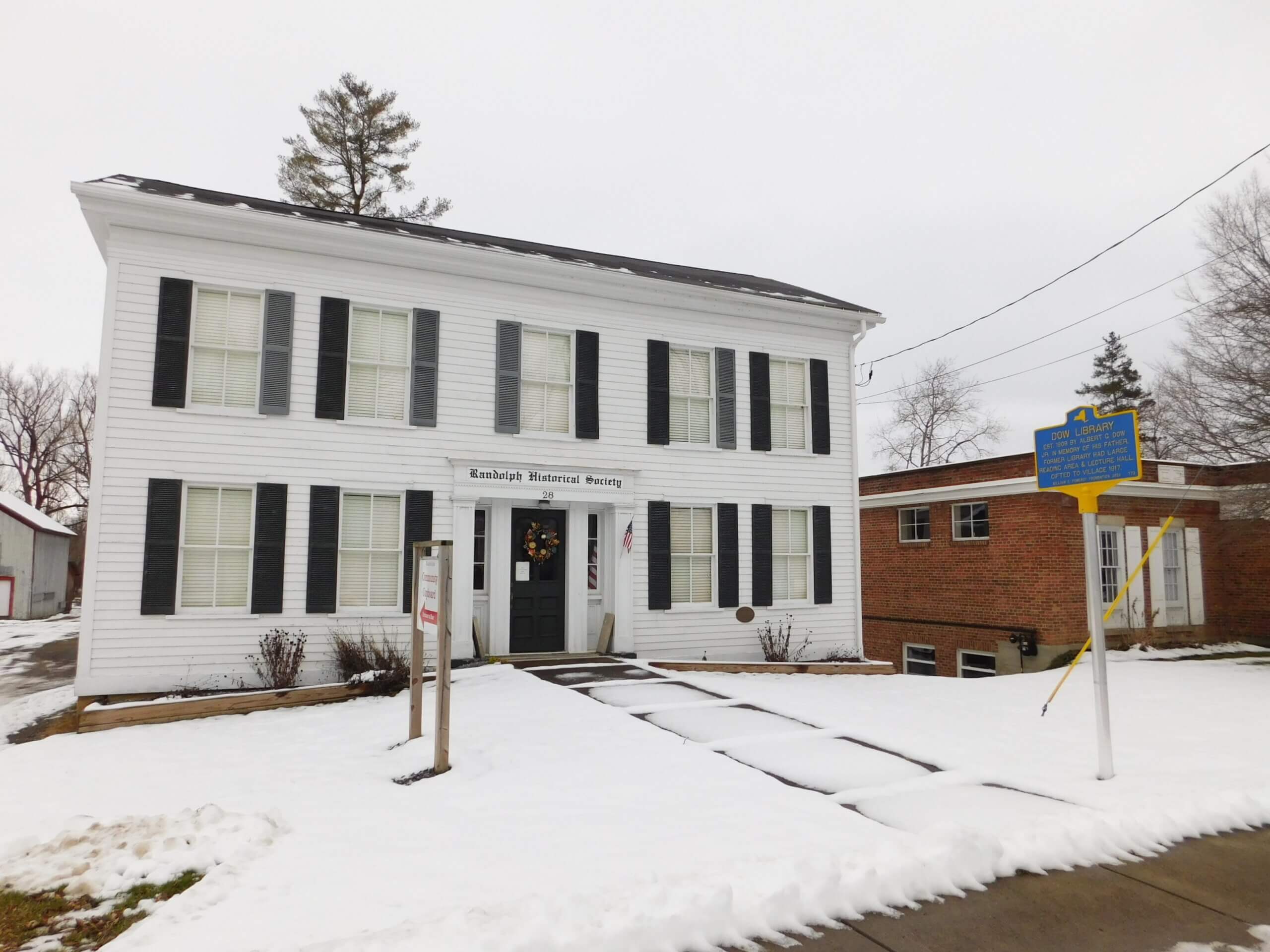 In 1909 Albert G. Dow Jr. funded the establishment of a private library in this building in honor of his late father Albert G. Dow, Sr., who passed away the previous year. Initially named the Dow Private Library, its collection began with 1,417 books. The building included a large reading room and lecture hall. In 1917 it was given by Dow to the Village of Randolph and renamed the Albert G. Dow Free Library.