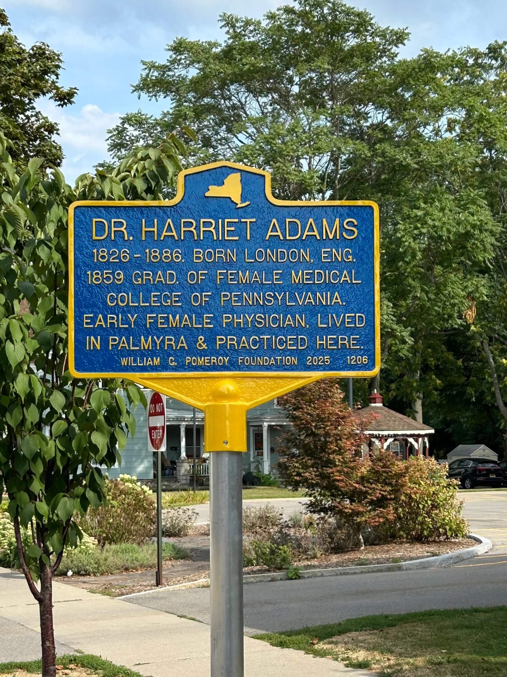 After graduating, Dr. Adams practiced in Palmyra, NY for over 30 years, according to her obituary (Democrat and Chronicle, March 31, 1886). An advertisement from 1873 lists her office at 36 Main St in Palmyra, and today that address is now 330 E Main St., where the marker is placed. She described herself as a “homeopathic physician and surgeon” in The Wayne County Journal (July 10, 1873).