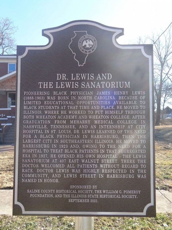 DR. LEWIS AND THE LEWIS SANATORIUMPIONEERING BLACK PHYSICIAN JAMES HENRY LEWIS (1888–1963) WAS BORN IN NORTH CAROLINA. BECAUSE OF LIMITED EDUCATIONAL OPPORTUNITIES AVAILABLE TO BLACK STUDENTS AT THE TIME AND PLACE, HE MOVED TO ILLINOIS, WHERE HE WORKED TO PUT HIMSELF THROUGH BOTH WHEATON ACADEMY AND WHEATON COLLEGE. AFTER GRADUATION FROM MEHARRY MEDICAL COLLEGE IN NASHVILLE, TENNESSEE, AND AN INTERNSHIP AT CITY HOSPITAL IN ST. LOUIS, DR. LEWIS LEARNED OF THE NEED FOR A BLACK PHYSICIAN IN HARRISBURG, THEN THE LARGEST CITY IN SOUTHEASTERN ILLINOIS. HE MOVED TO HARRISBURG IN 1923 AND, OWING TO THE NEED FOR A HOSPITAL TO TREAT BLACK PATIENTS IN THAT SEGREGATED ERA IN 1927, HE OPENED HIS OWN HOSPITAL – THE LEWIS SANATORIUM AT 407 EAST WALNUT STREET. THERE THE DOCTOR WELCOMED ALL PATIENTS WITHOUT REGARD TO RACE, DOCTOR LEWIS WAS HIGHLY RESPECTED IN THE COMMUNITY, AND LEWIS STREET IN HARRISBURG WAS NAMED IN HONOR.