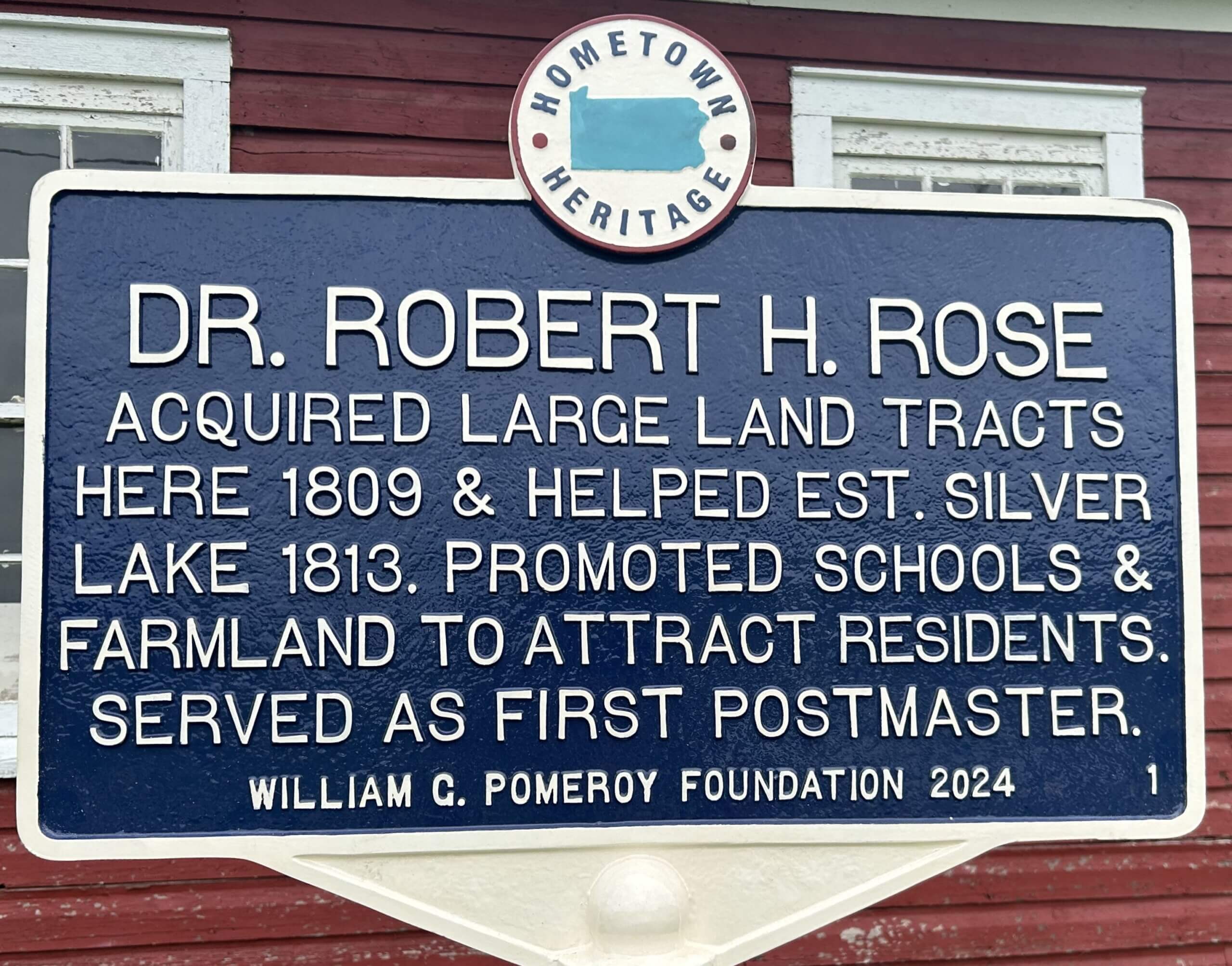 In 1809, Dr. Robert H. Rose acquired 248 land tracts, estimated at over 99,000 acres of land in total, in what was then Luzerne County, Pennsylvania. The following year, Susquehanna County was formed from part of Luzerne County and in 1813, Dr. Rose helped to establish the township of Silver Lake in the new county. He served as the first postmaster of Silver Lake until his death and as the first president of the Silver Lake Bank, founded in 1817.
