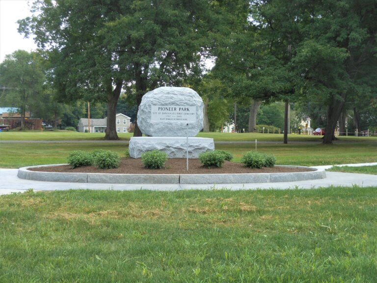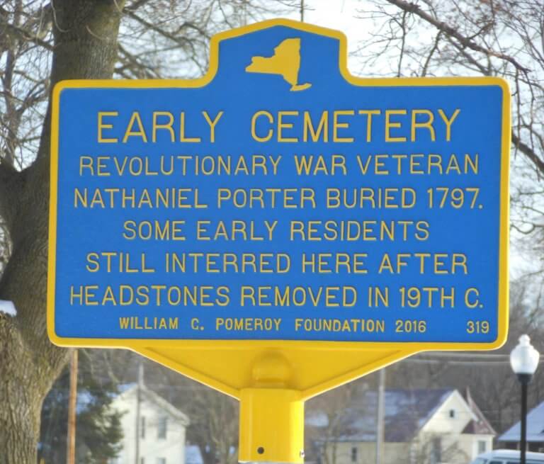 In 1810, Nathanial Rochester deeded four acres of land, including land known as the village square and old cemetery grounds, to a “Union Society.” the Union Society, however, never had a legal existence. In the 1840s, many of the markers were removed, but the remains never exhumed. In 1889, another 35 headstones were removed. Many headstones were transferred to Greenmount Cemetery and stored behind a barn. These stone were inventoried in 1954 by Town Historian Wutz Rauber with assistance from the Boy Scouts. Remains continued to be discovered at this site as late as 1953. The first known burial on this site, now known as Pioneer Park, was Revolutionary War veteran Captain Nathaniel Porter in 1797. Porter was the father-in-law of Captain Daniel Faulkner, for whom Dansville is named.