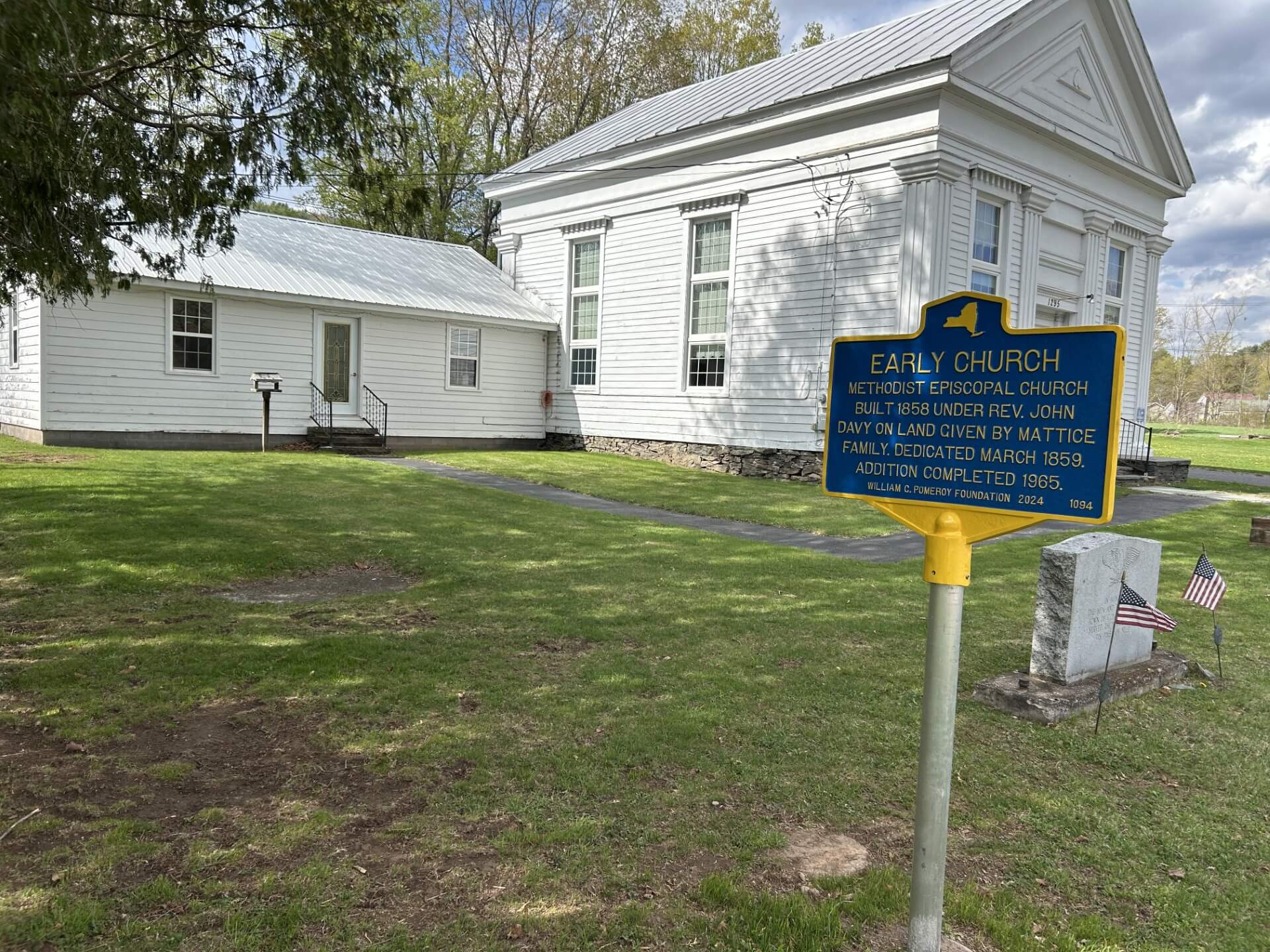 In 1858, a Methodist Episcopal church was built in the town of Conesville in Schoharie County, New York under Reverend John Davy. Land for the church building was given by the Mattice family, a local family of farmers. The church was dedicated in March 1859. In 1965, the community completed an addition to the church to provide a dedicated space for their Sunday School program.