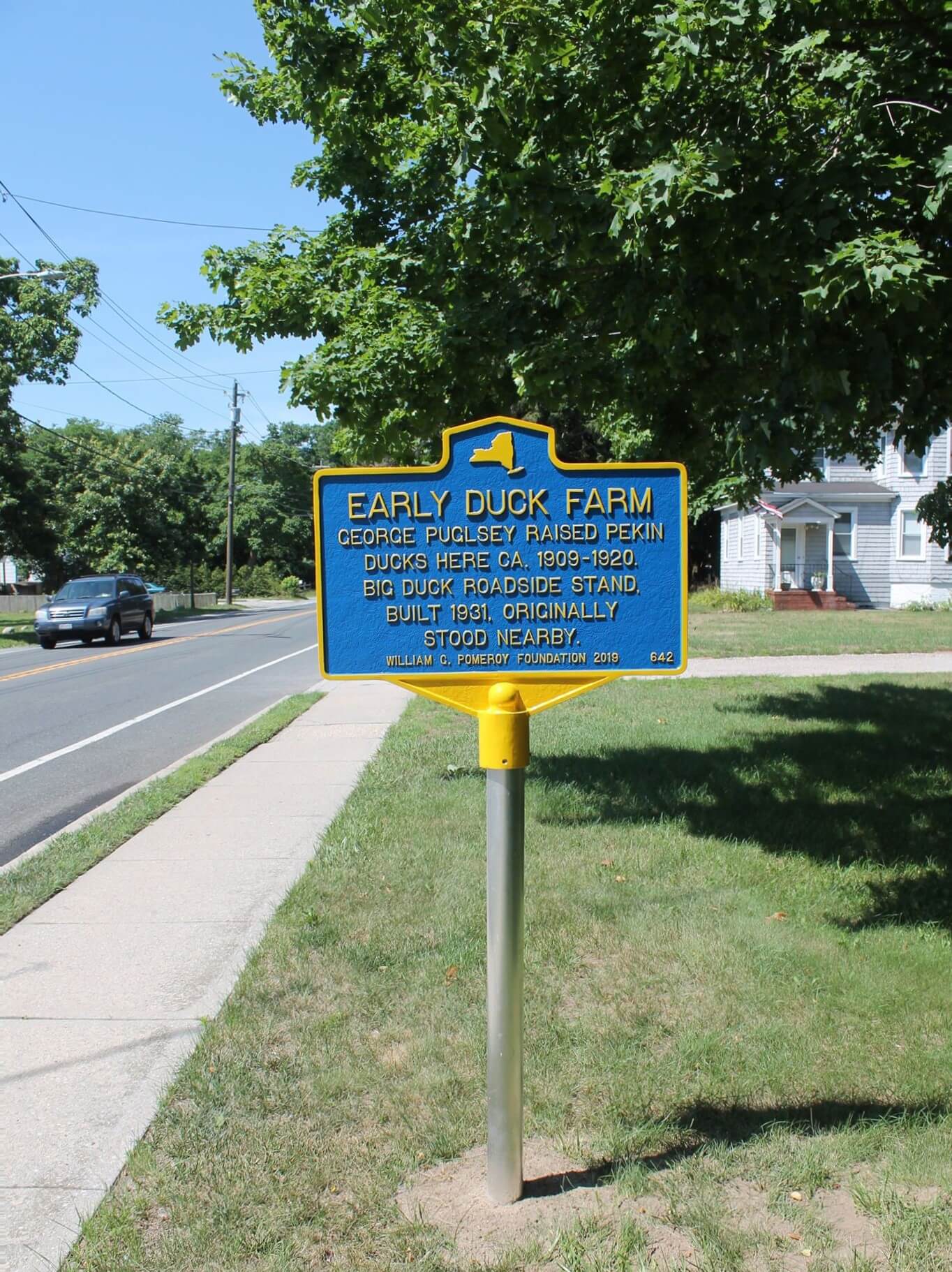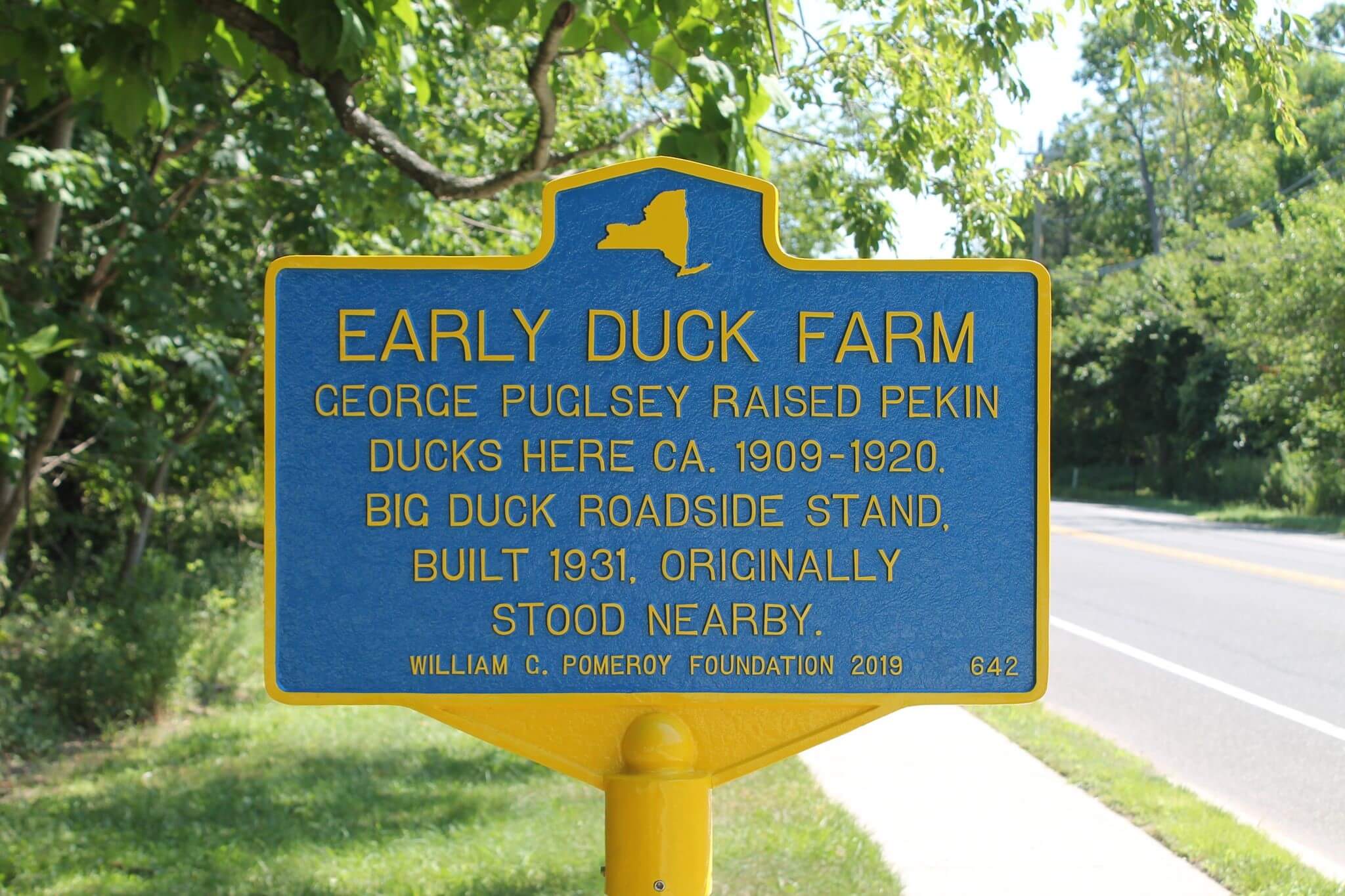 George Pugsley’s Duck Farm and the former site of The Big Duck roadside stand resides in the community of Riverhead, NY. As early as 1909, resident and duck rancher George Pugsley raised Pekin ducks here and was extremely successful. In 1919, Pugsley nearly lost his farm. The event was described in a November 4, 1919 article from the Brooklyn Daily Eagle: