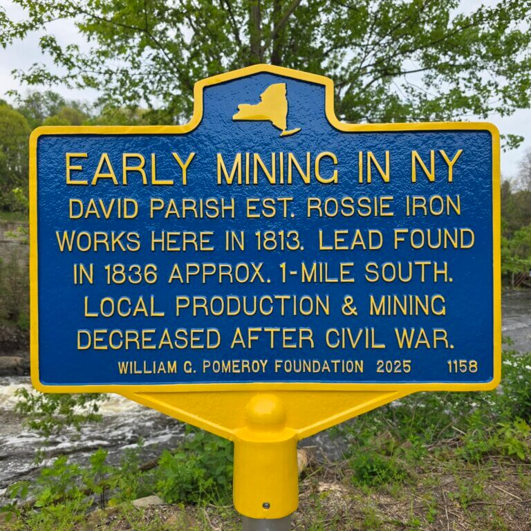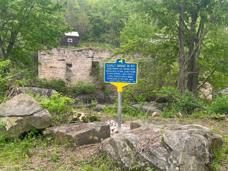 Rossie’s industrial significance began with financier David Parish, who discovered iron deposits in the area and founded the Rossie Iron Works in 1813. His investments and leadership attracted skilled laborers and spurred the region’s economic development, though he eventually returned to Europe, leaving his holdings to his brother, George Parish. In 1835, Parish’s nephew expanded Rossie’s industry by establishing a lead smelting plant following the discovery of a lead vein south of their property. The ironworks primarily produced pig iron and castings, materials essential for infrastructure projects such as bridges and tools, while lead mining supplied industries—including ammunition production. This mining boom brought prosperity to Rossie, attracting workers and their families and transforming it into a bustling community, thanks to several veins discovered in the area. (Samuel Durant, History of St. Lawrence Co., New York, 1878, 15-15)