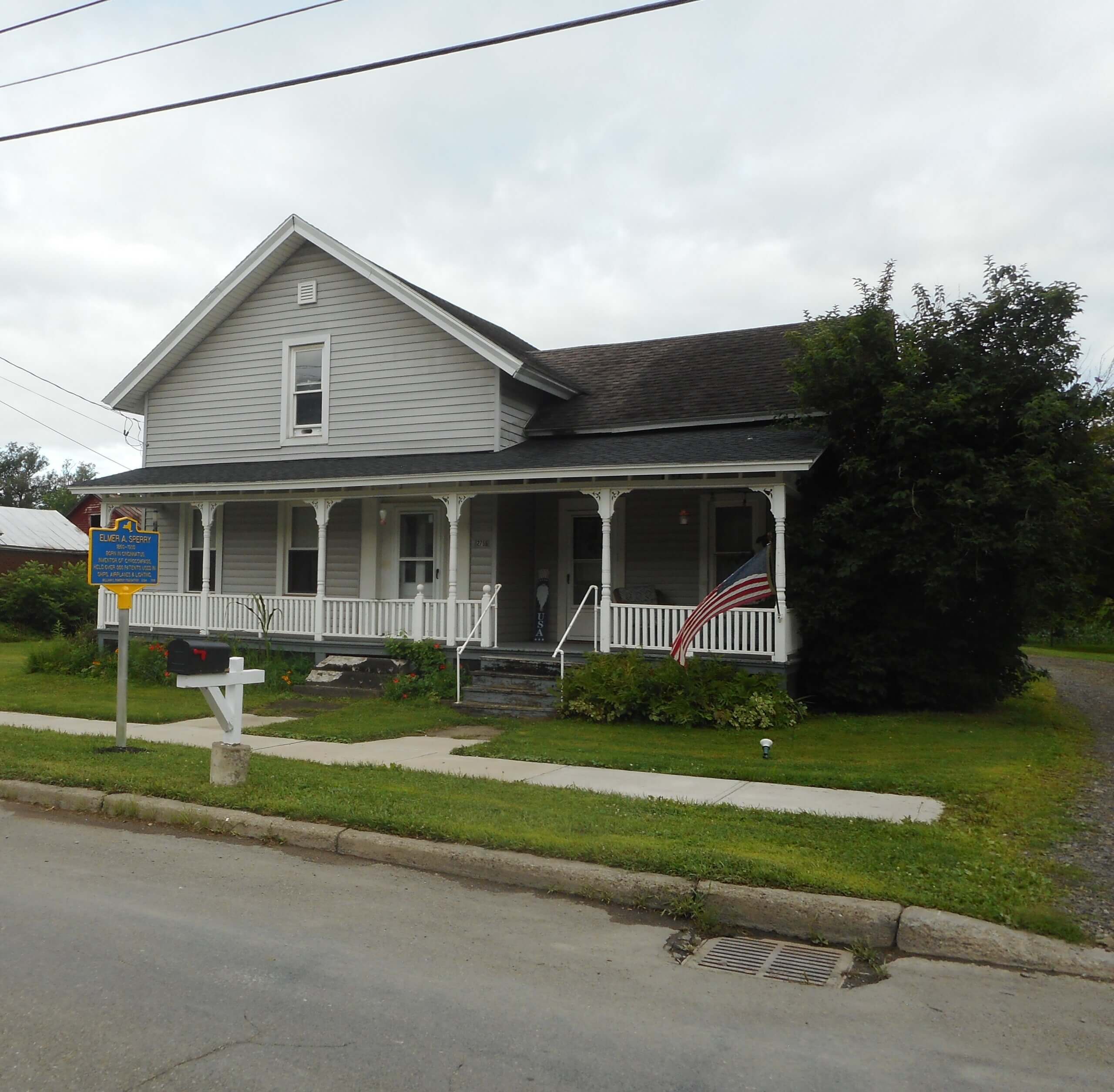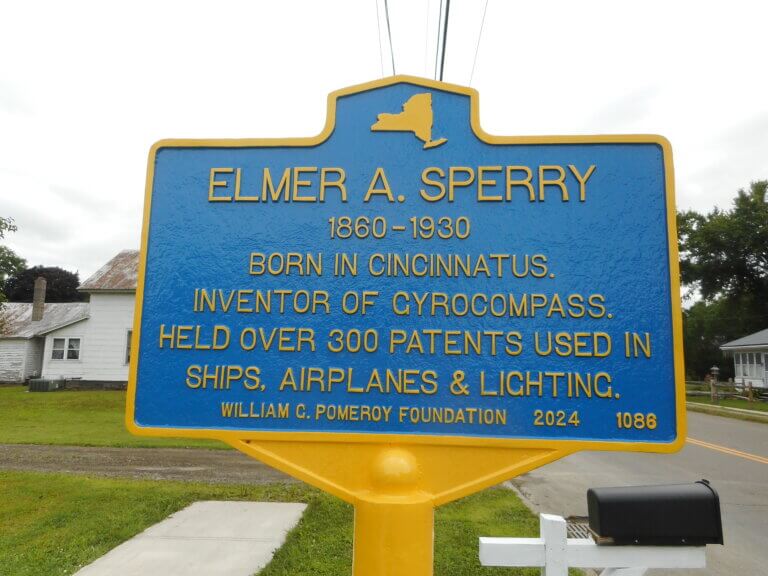 Elmer Ambrose Sperry was born in Cincinnatus, New York on December 1, 1860 to Stephen and Mary Sperry. While the Sperrys were residents of Cortland, NY, it is believed that Elmer was born at the home of his maternal grandparents on Lower Cincinnatus Road (Cortland Standard, April 4, 1932). The marker stands in front of their former home. A 1922 U.S. passport application signed by Elmer Sperry attests to his birth in Cincinnatus.