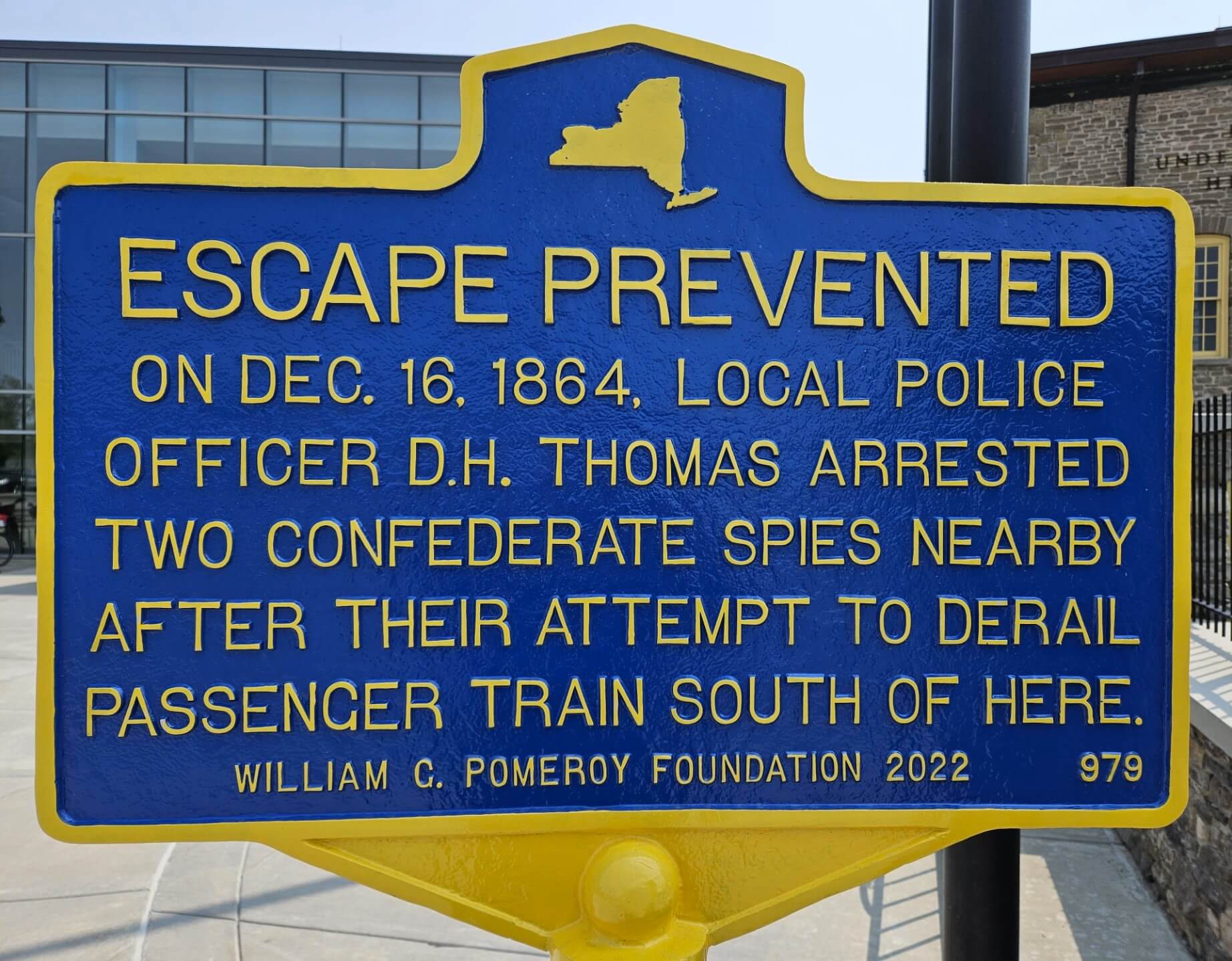 The marker sits at the location of the former passenger depot where the two spies were arrested, between the Underground Railroad Museum and the Niagara Falls Amtrak within view of the Whirlpool Bridge, which would replace the suspension Bridge Beall and Anderson had hoped to cross.
