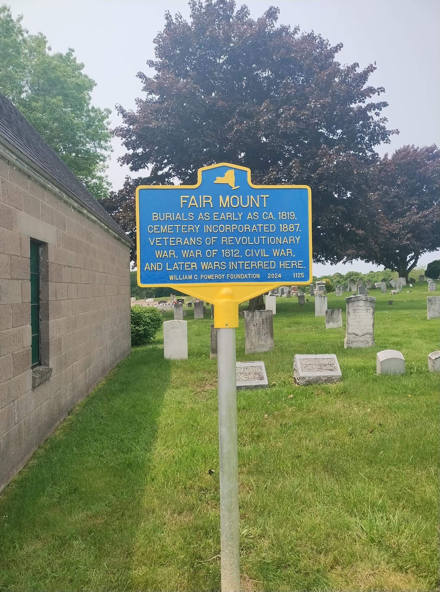 Fair Mount Cemetery in the village of Red Creek in Wayne County, New York, contains burials dating to as early as circa 1819, coinciding with the early years of development of the surrounding area. The cemetery was officially incorporated in 1887. Those interred here include veterans of the Revolutionary War, War of 1812, Civil War, and later wars, including the Spanish-American War, both World Wars, and the Korean War.