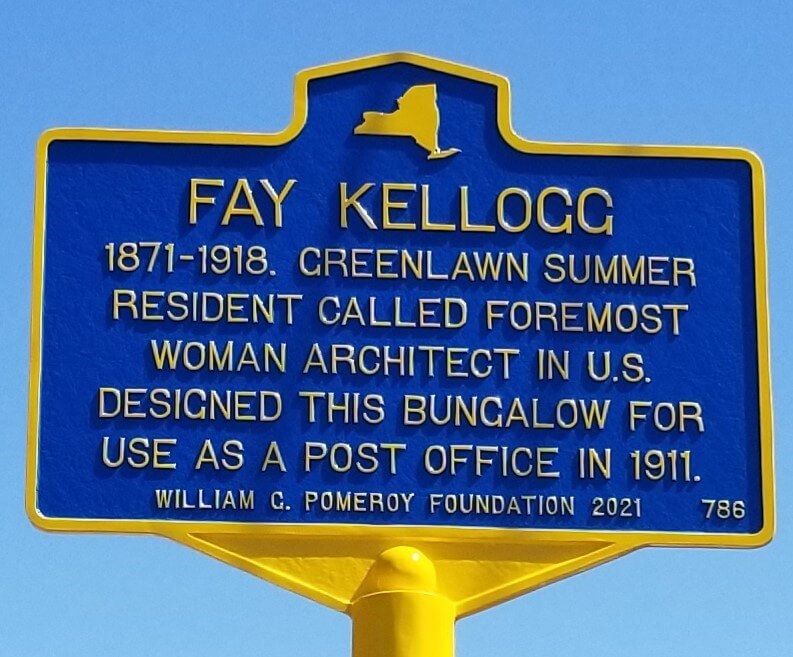 Referred to as the “foremost woman architect in the United States” by contemporary newspapers, Fay Kellogg (1871-1918) was a summer resident of Greenlawn, NY. In 1911, Kellogg designed the bungalow at 22 Boulevard Avenue in Greenlawn for use as a post office. In addition to her work as an architect, she was a proponent of women’s suffrage and equality.