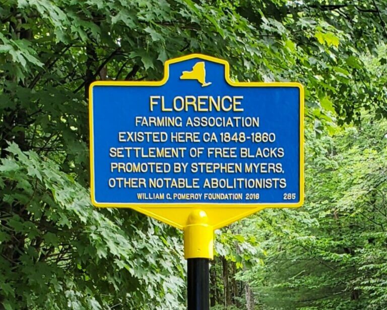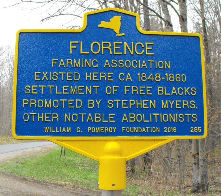 The Florence Farming Association was established around 1845 near this site. It was intended to create a community where free blacks could own land and farm. Local abolitionist and philanthropist Gerrit Smith bought the land and by 1849 there were roughly 80-90 families who called Florence home. For a little over twelve years this small community flourished. After 1860, the Florence Farming Association ceased to exist and the community disbanded.