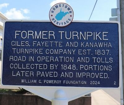 In 1837, the Giles, Fayette and Kanawha Turnpike Company was incorporated through a legislative act passed by the Virginia General Assembly “for the purpose of constructing a turnpike road from the Kanawha salt works, in the county of Kanawha, by the falls of Kanawha river, and Vandal’s in the Loop, to Giles courthouse.” By 1848, three tollgates had been erected and the road was in operation with tolls collected throughout the year.