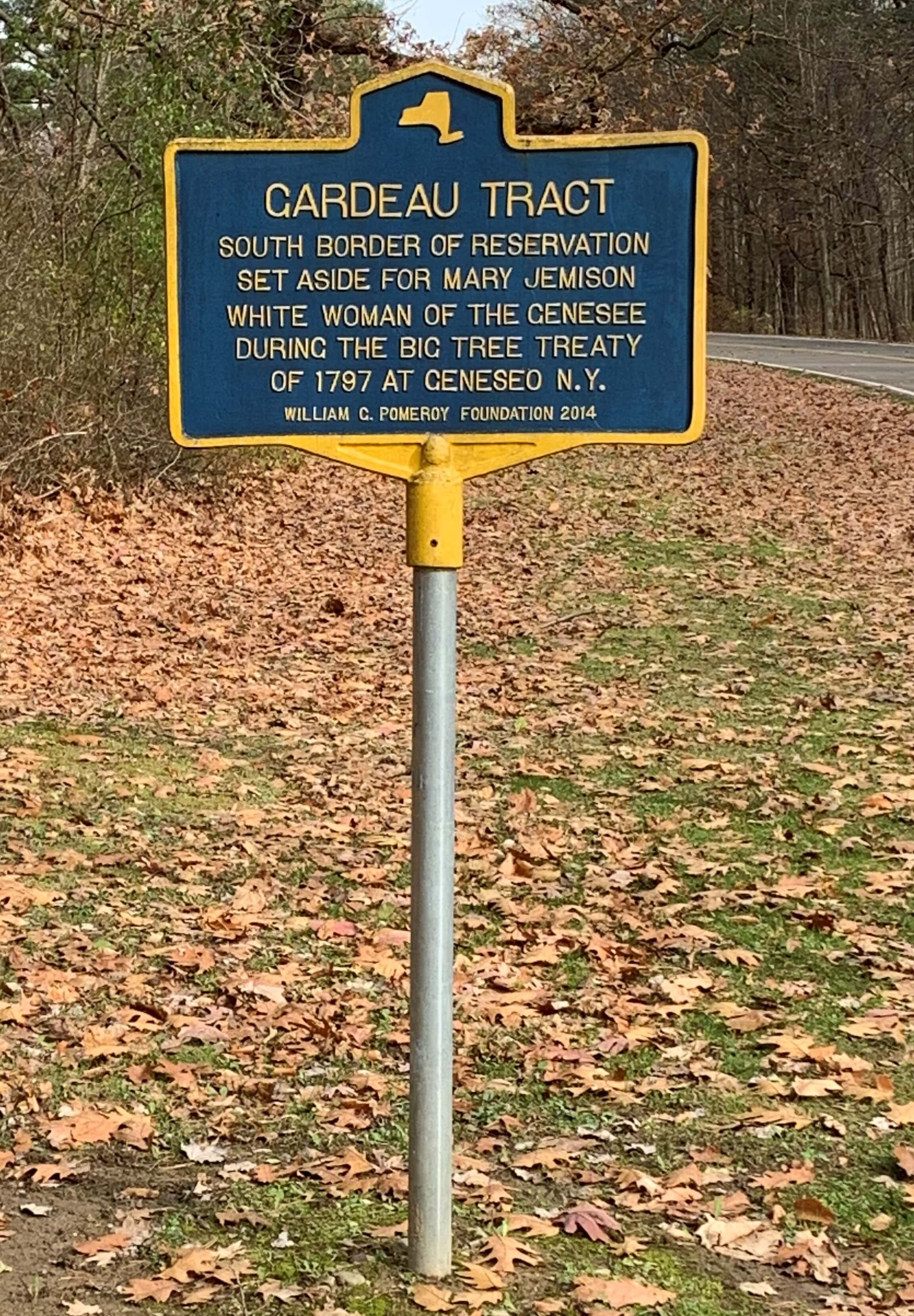 The Gardeau Tract contained 17,927 acres on both sides of the Genesee River. The land was reserved for Mary Jemison by the Seneca Nation in the Big Tree treaty of 1797. Known as “The Old White Woman” or “The White Woman of the Genesee,” Jemison’s family emigrated from Ireland to Pennsylvania in 1743. In 1755 she was captured by the Senecas at age of 12 or 13 and was adopted by them, in turn became fully assimilated into their customs and habits. She grew to be strongly respected by both the Senecas and white settlers. The name “Gardeau” derives from a hill on the property. The east and west borders of this property lies within the town of Castile.