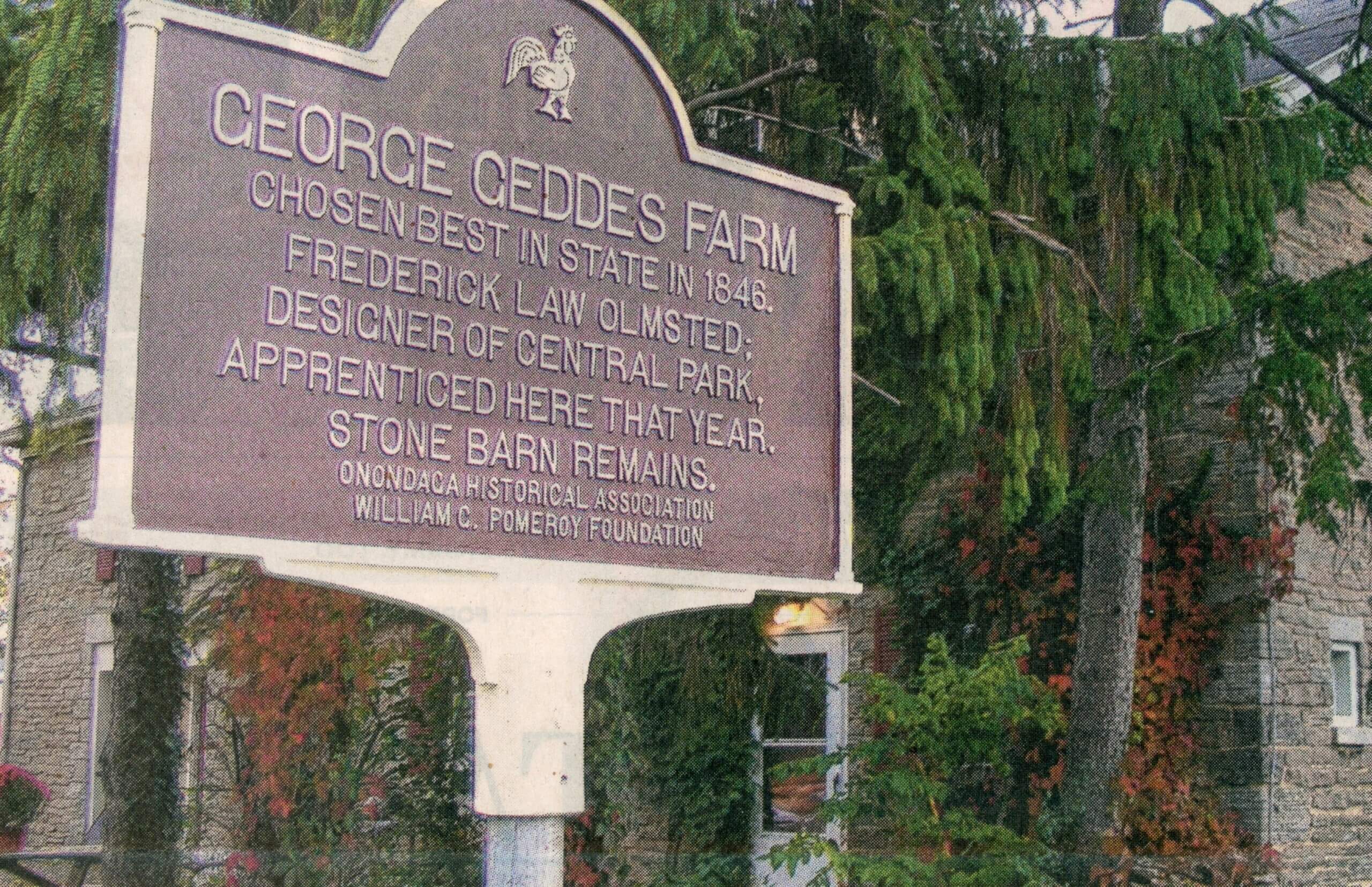 George Geddes, son of Town of Geddes namesake James Geddes, was nationally known in agricultural circles for his model farm in Fairmount. Approximately 500 acres in size, it was noted for its productivity. Twice it was entered for competition at the New York State Fair and twice Geddes received the first prize. Geddes was a mentor to Frederick Law Olmsted, famous for designing many well-known urban parks, including Central Park in New York City.